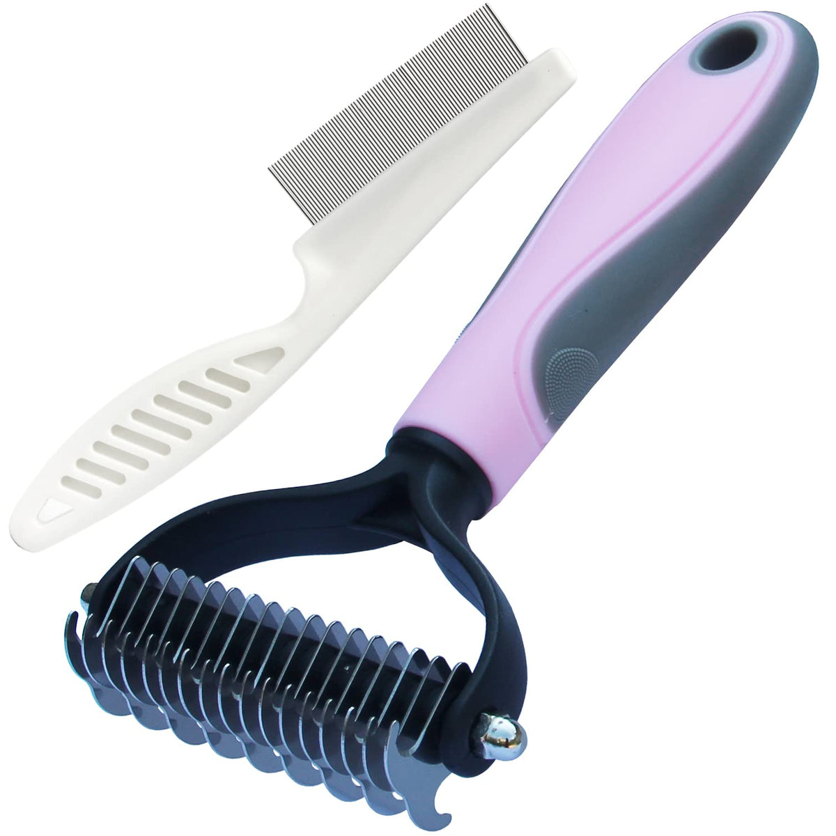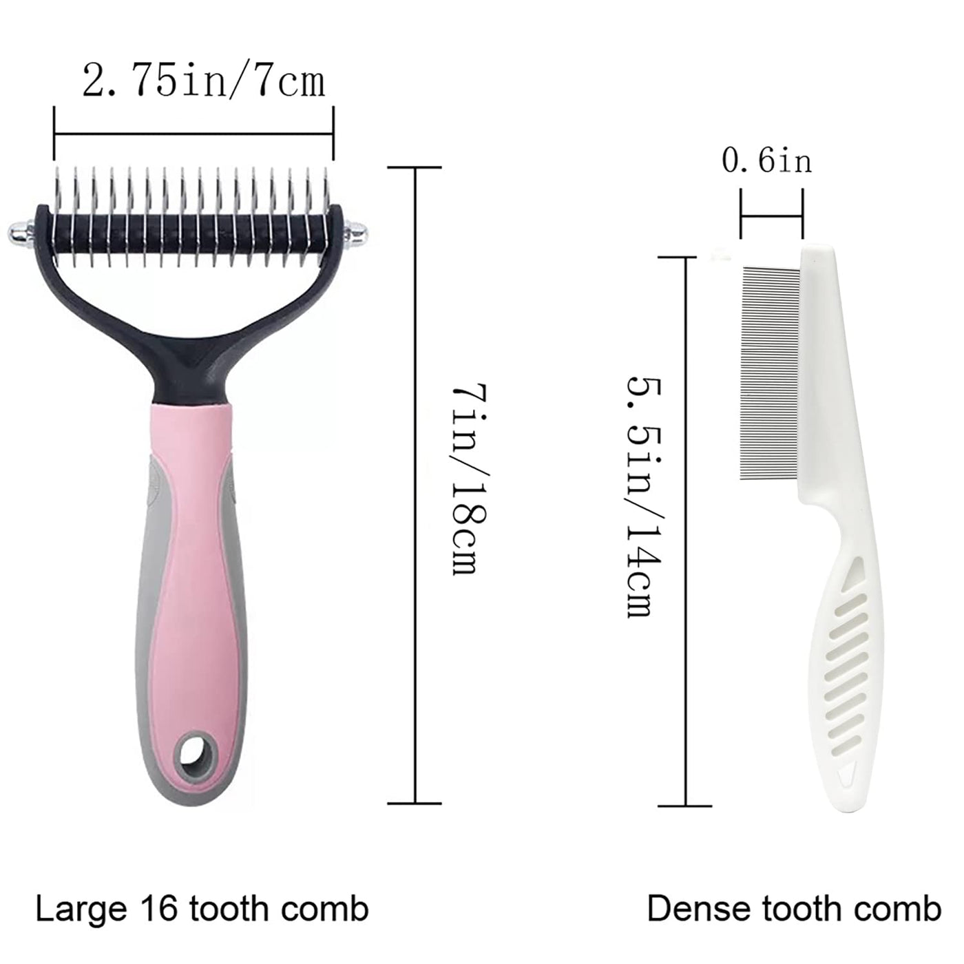 Q: How does the double-sided undercoat rake comb work for deshedding my pet?A: The double-sided undercoat rake comb features rounded teeth on the outside that gently massage your pet's skin while the inner teeth are sharp enough to cut through tough mats and tangles. This design allows for effective grooming, helping to remove loose hair and reduce shedding without causing irritation.