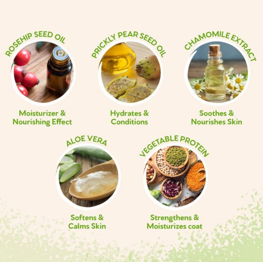 Q: What are the main ingredients in this puppy shampoo?A: The shampoo features natural oils and extracts, including prickly pear and rosehip seed oil, which help hydrate and condition your puppy's skin, along with chamomile for additional nourishment.