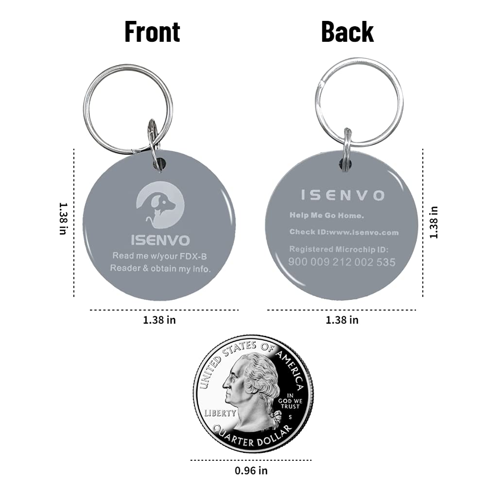 ?Microchip Tag for Dog? -Dog tag with microchip is a reliable way to get your contact information—as well as vital information about your dog’s medical conditions—and increase the odds she/he’ll be returned to you if she/he’s found. ?Free Pet Retrieval Service? -The ID tag has a built-in microchip, which can be read by scanner. You can be hung on the pet collar. Also, you can use the pet retrieval service provided by the ISENVO website for free forever. If your pet is lost, people can use the pet ID to get in touch with the pet owner through our website.(You need to register your ID on the website in advance.) ?User-friendly?-The chip number and usage method are written on the tag, which is convenient for the person who found the dog to contact the dog owner. ?Light & Waterproof & Durable?-Great ID Tag for your Dog & Cat - When it comes to durability and quality our tag holds up to the most active pet. ?Protect the Dog Owner’s Privacy?-It will not display any owner's information. The person who finds the dog can only contact the dog owner through the tag ID number on ISENVO website.
