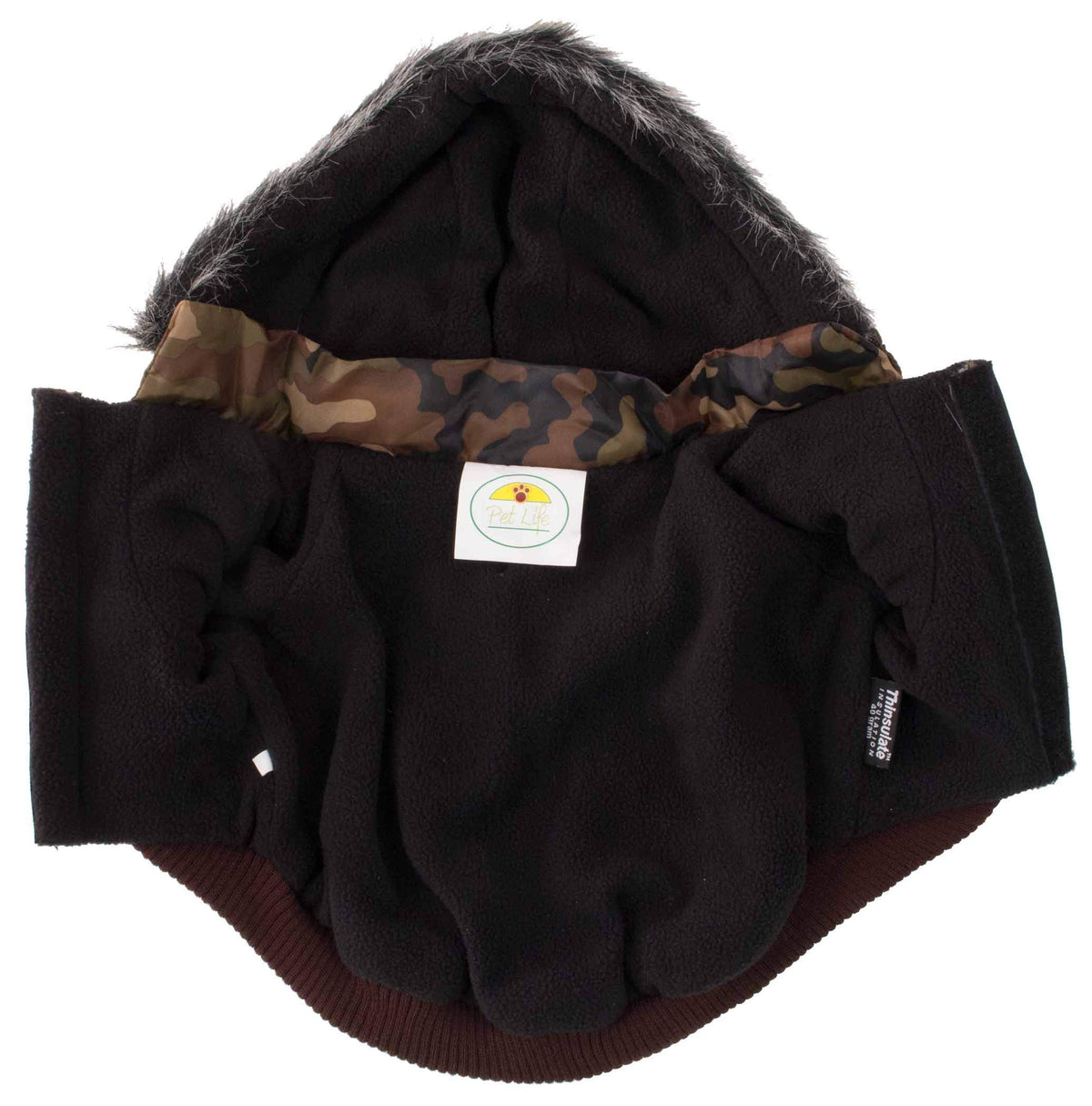 Pet Life metallic ski parka for dog contains Thinsulate thermal heat retention technology specially inserted between the fabric. Features matching tone on tone inner fleece fabric. Includes a removable faux-fur zippered hood and usable back pockets. Pet will stay toasty warm through those harsh cold weather conditions. Protect precious pooch from the elements with this fashionable, high quality garment. Machine wash and lay flat to dry. Available in camouflage color and x-small size. Feet for 8-inch to 10-inch neck size from base of neck to base of tail.