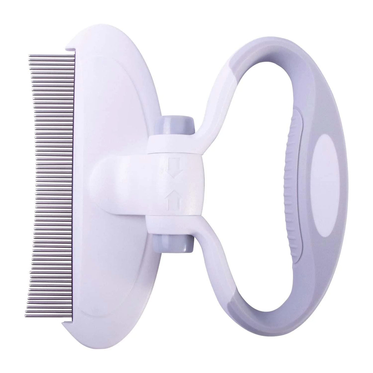Q: Is the handle of the Pet Life 'Gyrater' Comb adjustable?A: Yes, the handle features a squeeze-to-adjust rotating hinge that locks into place, allowing you to customize your grip for better control and comfort during grooming sessions.