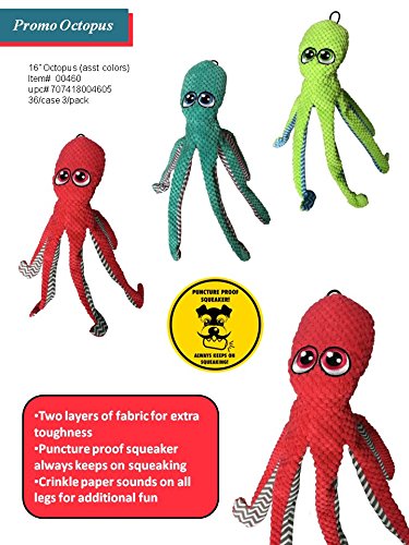 Q: What color options are available for the Pet Lou 16 Inch Octopus?A: The Pet Lou 16 Inch Octopus comes in assorted colors, allowing for a fun and vibrant addition to your pet's toy collection.