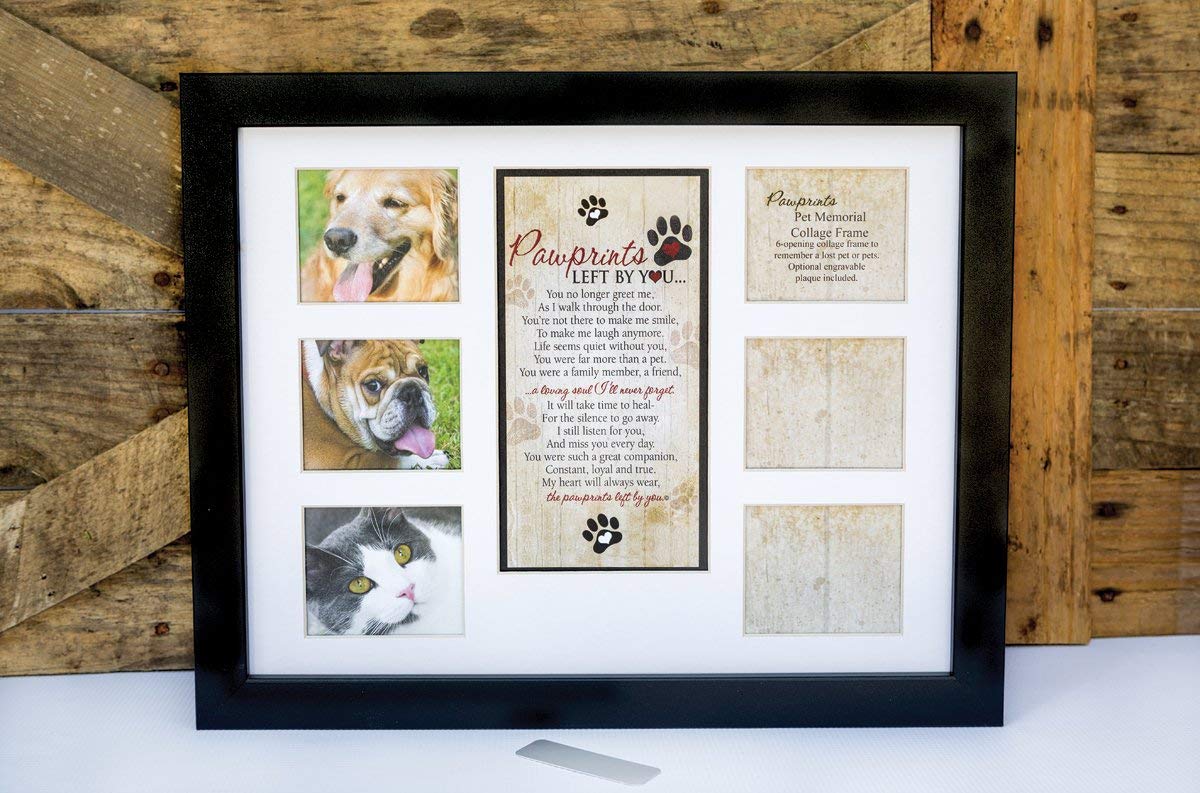This beautiful memorial pet picture frame is designed to honor a best friend. The black frame features the wording: Paw Prints Left by You... You no longer greet me, As I walk through the door. You're not there to make me smile, To make me laugh any more. Life seems quiet without you, You were far more than a pet. You were a family member, a friend, A loving soul I'll never forget. It will take time to hear- For the silence to go away. I still listen for you, And miss you every day. You were such a great companion, Constant, loyal and true. My heart will always wear, The pawprints left by you.' 6 openings for photos of pet. For tabletop or wall display. Measures approximately 16 x 13 x 1 inches.