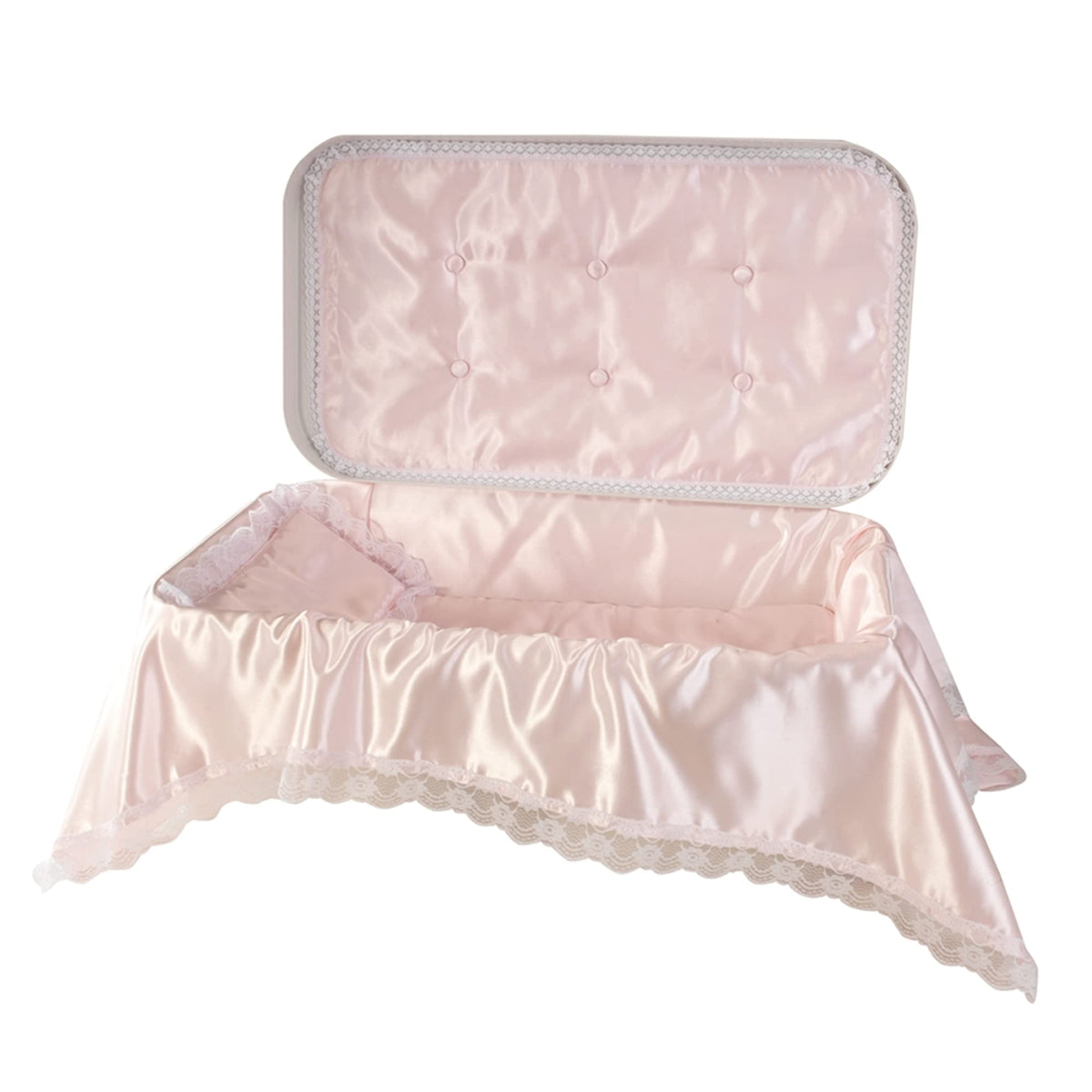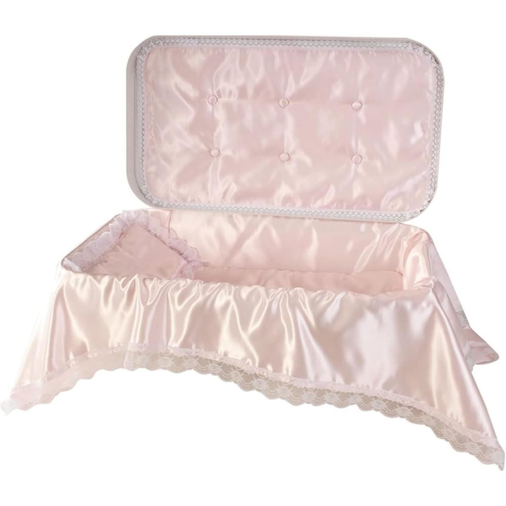 This Pet Memory Shop 'Elegance Series' pet casket is hand-made and contains a top cover, laced coverlet, pillow, and a plush mattress hand-made of elegant satin/silk fabric to ensure that your beloved animal companion is laid to rest in a manner that is respectful and safe. The exterior shell is composed of two-piece, high-impact polystyrene material for sealing and protection. It is air-tight, water-tight to ensure maximum protection for your beloved animal companion.
