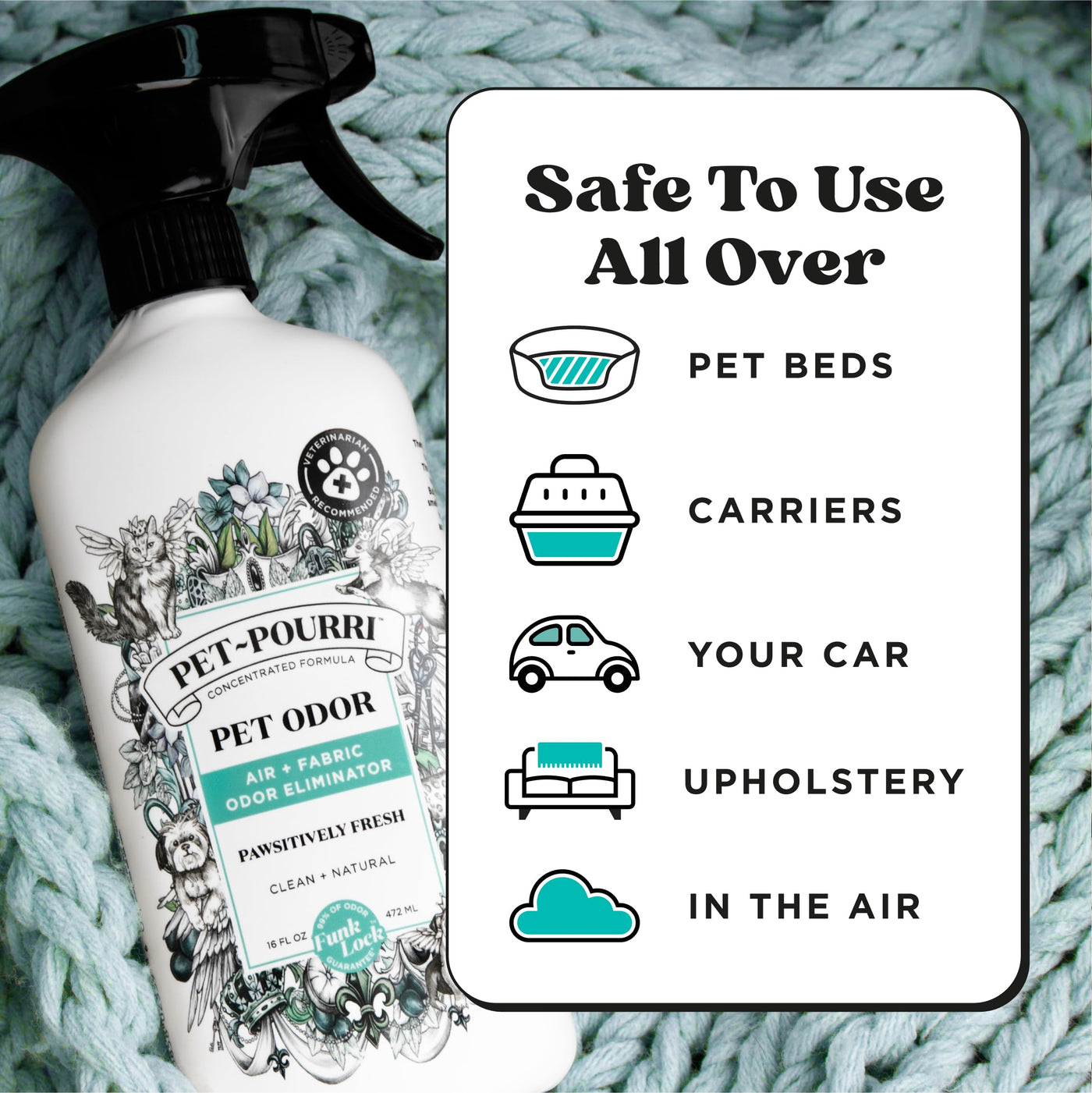 Q: Can I use Pet-Pourri on fabrics and carpets?A: Absolutely! Pet-Pourri is designed for multi-purpose use and can be safely sprayed on various surfaces including pet bedding, furniture, carpets, and even car seats, making it an ideal solution for maintaining a fresh and odor-free home.