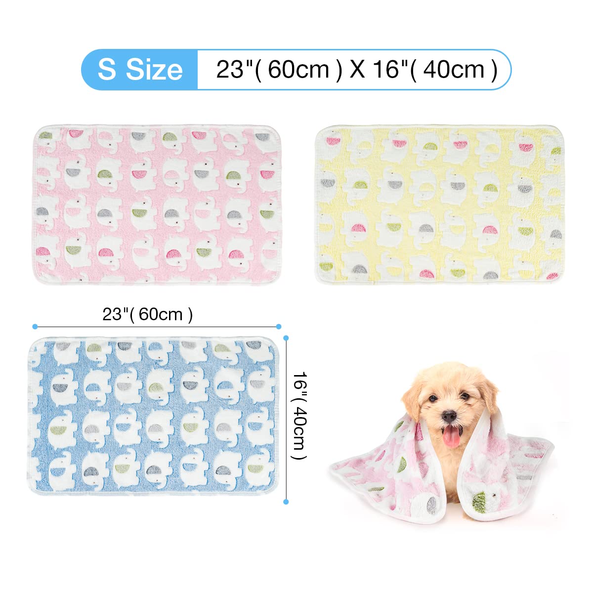 et Soft Blankets: 3 sizes of our cute blankets Small 23*16 (60*40cm) Medium- 30*20 (76*52cm) Large-41*31 (104*78cm) 3 IN ONE PAcK: There are 3 different colors (pink yellow blue) of pet blankets in one cute pack which is easy to take and storage it is cost-effective and convenient WARMINg PET BLANKET: The cute dog blanket could be used for dogs cats other animals in every season and many situation as afternoon napping or taking shower REAT gIFT FOR PUPPY: cute printed patterns soft warm material safe and well absorbent its amazing to prepare as a new gift for your puppies playing laying napping EASY TO cLEAN: Our puppy blankets are well made by soft coral velvet fabric fuzzy cozy and soft material is great for your fur-baby itAs easy to wash and 100% machine washable never shed or fade