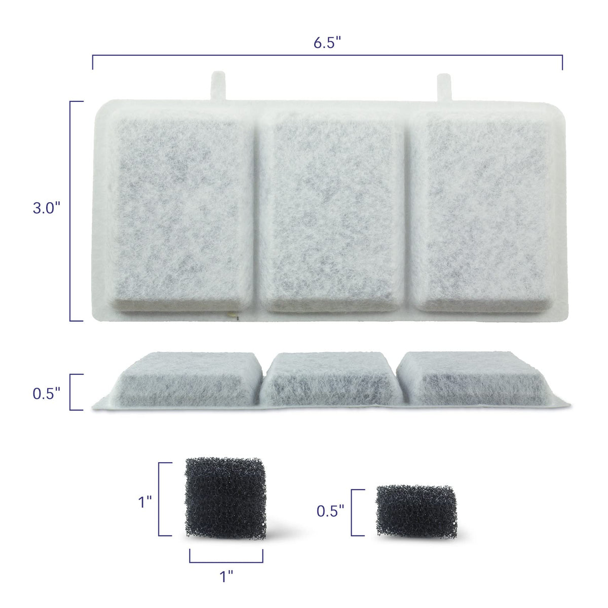 Q: What is included in the pack of PET STANDARD Replacement Water Filters?A: The pack includes 12 premium pet fountain replacement filters and 6 pre-filter sponges, all individually packaged and sealed to maintain high quality. This provides enough supply for 3 to 12 months of use.