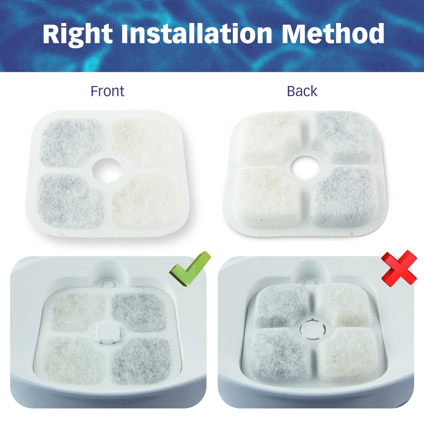 PETSTANDARD Replacement Filter Pack of 12 Filters Filter Measurements: 3.31' x 3.31' x 0.375' Triple Filtration System: Composed of a cotton layer, activated carbon and an ion exchange resin. Effectively to filter hair, heavy metals, keeps water fresh and improve the taste of the water. To prevent the activated carbon dust from shedding into water, please soak the cat fountain filter in water for 2 minutes then rinse thoroughly under running water before using. 2 to 3 weeks in summer and 3 to 4 weeks in winter. If multiple cats are using the fountain, more frequent replacement will be necessary.