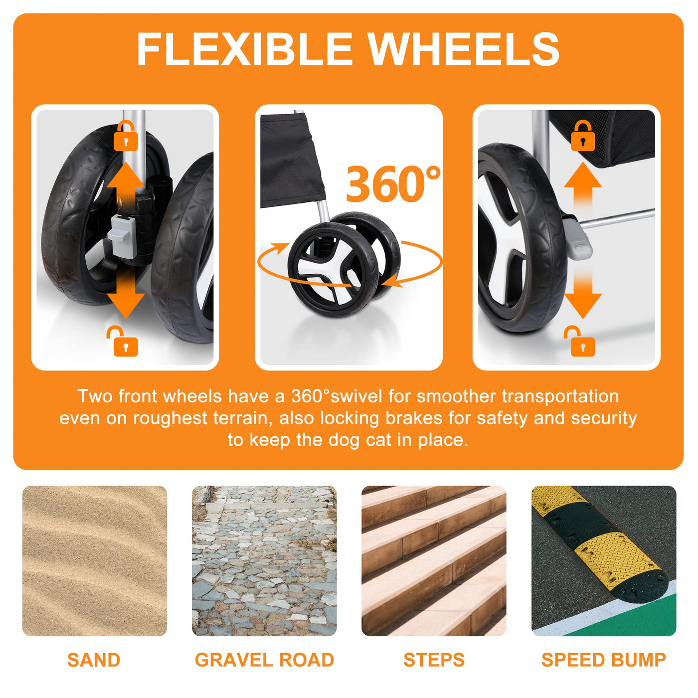 Features: Waterproof Oxford cloth with padded bottom is comfortable. Breathable mesh cover provide ventilation and great viewing. Front and back zipper access will be easier for you to put your pet in and out. Constructed of stainless steel tubes durable enough to last years of use. Easily set up, no tools required; Four wheels with rear brake for safe use. Folds up into compact size for convenient storage and save space. Dual cup holders and center tray for small items.