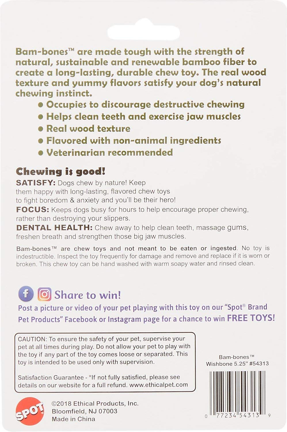 Q: What size is the Bam-Bones chew toy?A: The Bam-Bones chew toy measures 5.25 inches in length and is available as a pack of 3, providing great value and variety for your pet.