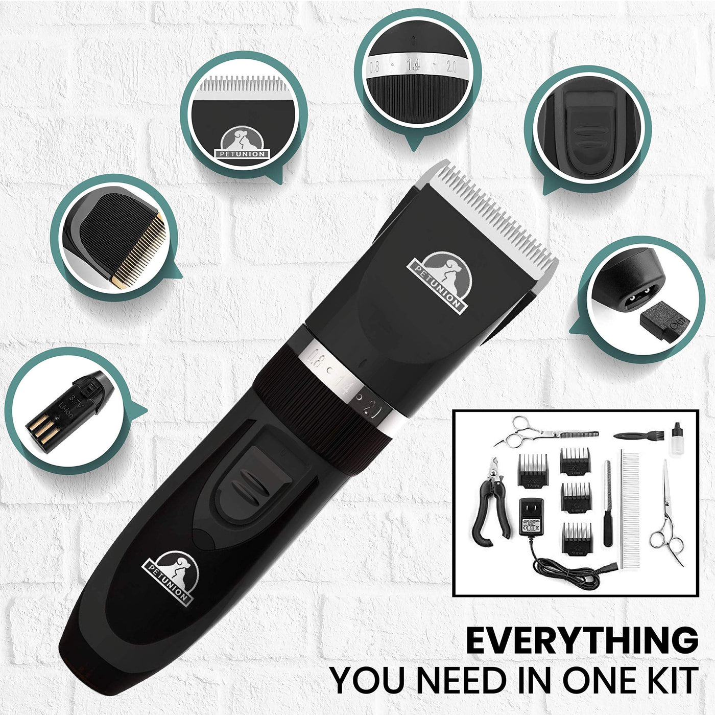 Everything You Need in One Kit - If youre looking for the complete pet grooming kit for your dog cat or other furry friend look no further Premium dog grooming clippers to help you professionally groom your pets coat and nails - Including clippers multiple guards nail trimmers scissors and more Low Vibration & Low Noise clippers - Have an anxious pet Have no fear Pet Unions low-vibration precision motor ensures whisper-quiet operation and a stress-free grooming experience for your little buddy Rechargeable & cordless - Thanks to an ergonomic design & rechargeable battery grooming with the Pet Union grooming kit for small and large dogs is a breeze for even the hardest-to-reach areas Adjustable Safe & Sharp Blades - Pet Unions grooming combs are contoured for the most skin-friendly grooming experience and thanks to the Precision-cut titanium blades theres no uncomfortable pulling at your pets hair Just a safe easy and comfortable grooming experience Proven Quality - Be sure tfo thin a thick coat with scissors to avoid any jamming One of the best track records and ratings history of any dog clippers for grooming on the market