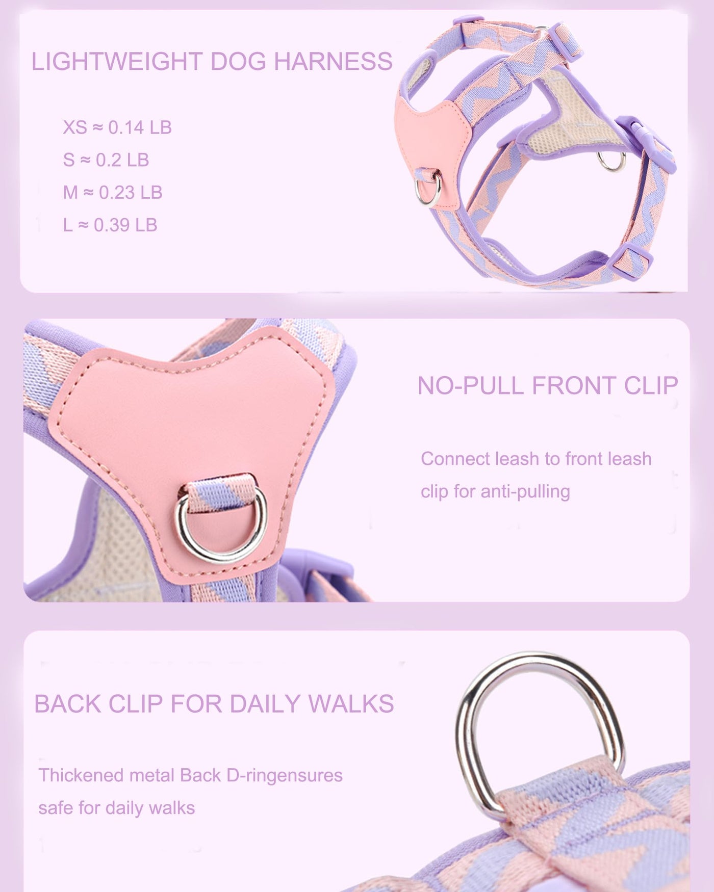 Lightweight and Breathable In Dopamine Colors Keeping Your Pet Comfortable and Stylish.Color-Blocking Design Available in Four Distinct Colors for Selection Pink Dog Harness Purple Dog Harness Black Dog Harness Bule Dog Harness.