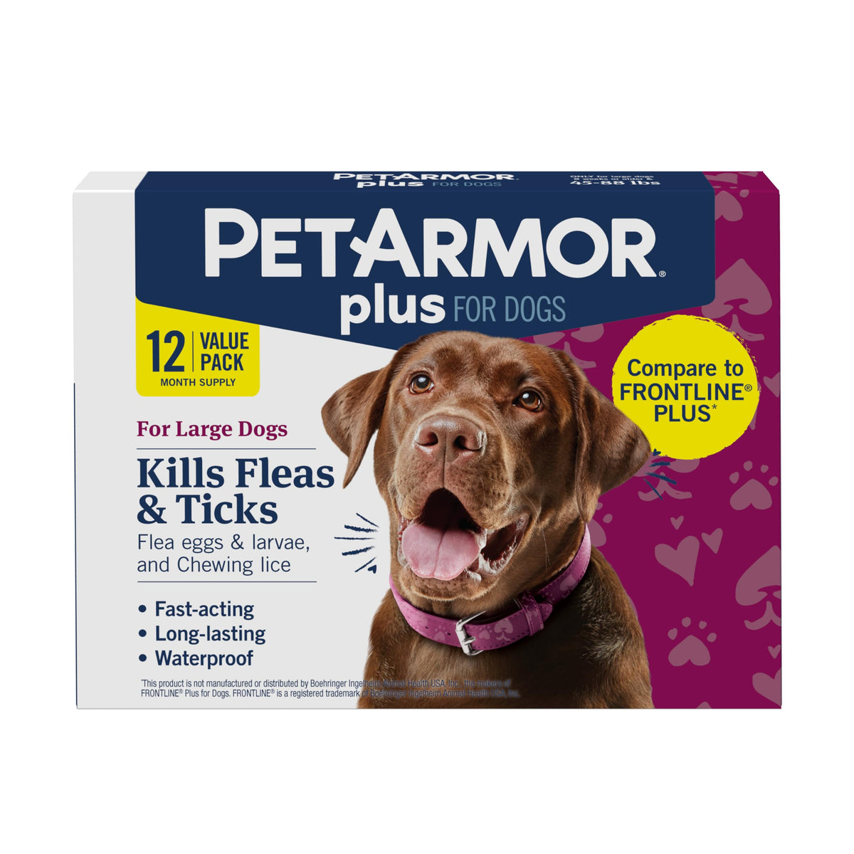 Your pets are family, and PETARMOR helps you confidently care for your dog, especially when it comes to flea and tick control. PETARMOR plus conveniently provides vet-quality protection without the expense of a vet visit. PetArmor Plus Flea and Tick Topical For Large Dogs 45-88 lbs., 12 weeks and older is a waterproof, fast-acting, long-lasting formula that kills adult fleas and ticks plus stops the flea cycle dead in its tracks. This dog flea treatment has the same active ingredients as FRONTLINE Plus for Dogs. Get nose to tail 30-day protection with each dose at an affordable price. One 12-dose package of PetArmor Plus Dog Tick and Flea Treatment offers twelve months of continuous coverage for all breeds.