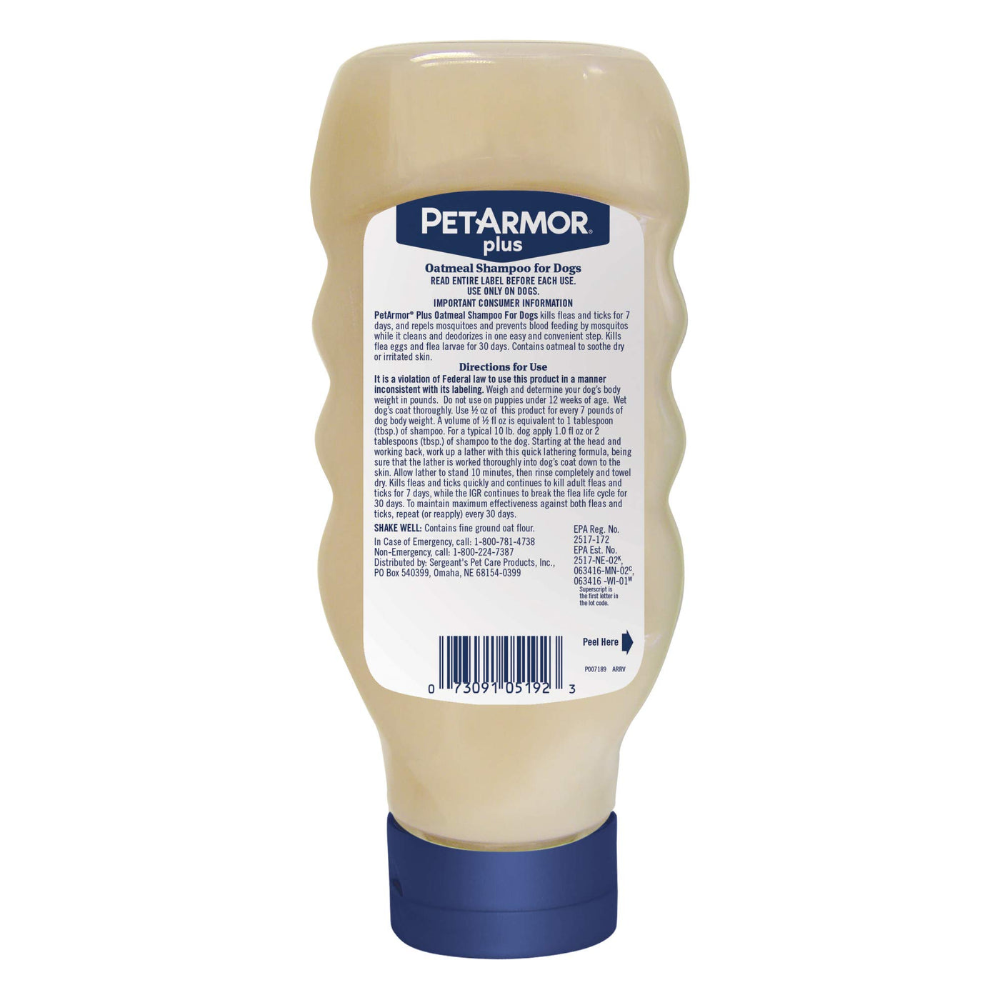 Your pets are family and PetArmor helps you confidently care for your dogs especially when it comes to flea and tick control. PetArmor conveniently provides flea and tick protection without the expense of a vet visit. This flea and tick shampoo for dogs with Oatmeal provides 7-day protection against fleas and ticks while soothing dry or irritated skin. Plus it helps prevent flea infestation by killing flea eggs and flea larvae for 30 days after application. This flea and tick bath starts working right away cleaning and conditioning your pet's coat and washing away the flea dirt that flea larvae eat to survive. You can confidently care for your dog At home with PetArmor flea and tick products. To apply first wet your pet thoroughly with warm water. Then apply the pet shampoo gloves are necessary. Simply lather the shampoo and gently massage it deep into your pet's coat and skin from head to tail. Rinse well with warm water. Keep Treated pets apart from each other other pets and children for 24 hours until the product has time to dry completely.IDEAL FOR DOGS: This rich conditioning formula with oatmeal kills pests that can harm your pet. The flea shampoo is ideal for dogs with sensitive skin. Not recommended for use on cats or kittens.RID YOUR DOG OF FLEAS: Flea and Tick Oatmeal Shampoo for dogs and puppies has a great Hawaiian ginger fragrance. This flea and tick formula kills fleas and ticks for up to seven days.CLEANS AND CONTROLS: Oatmeal Flea and Tick Shampoo cleans deodorizes and conditions your dog's coat and pH is balanced. It can also be used on dogs and puppies 12 weeks of age and over.FULL PACKAGE: 18 fl. oz. bottle contains powerful flea and tick shampoo.