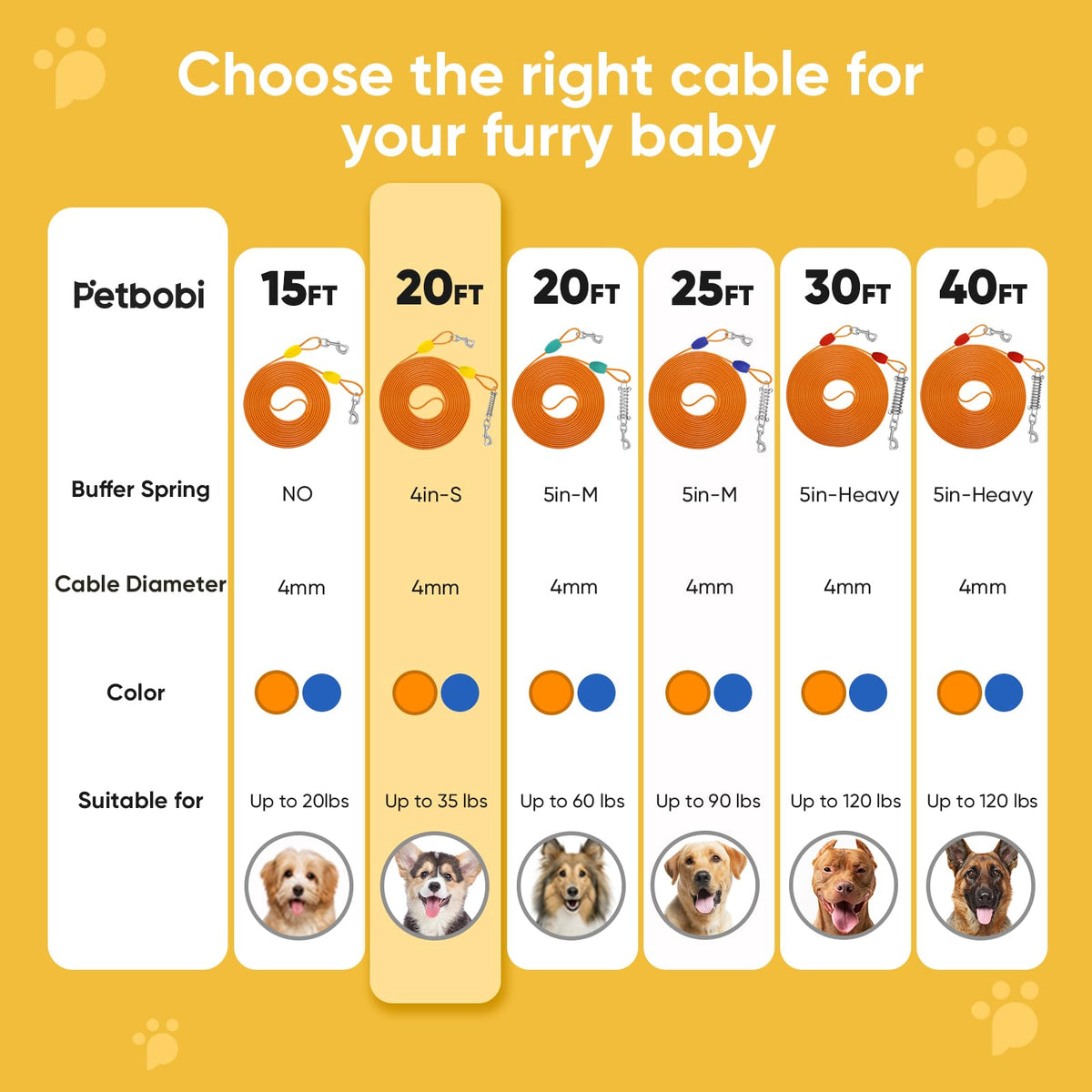 Petbobi Dog Tie-Out Cable 20Ft - Outdoor Leash 4Mm Metal Cable With Shock Absorbing Spring 360 Swivel Clips, Chain For Dogs Yard