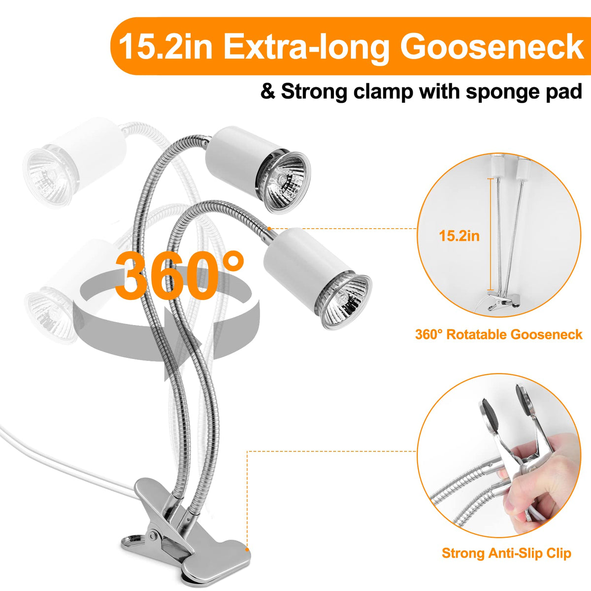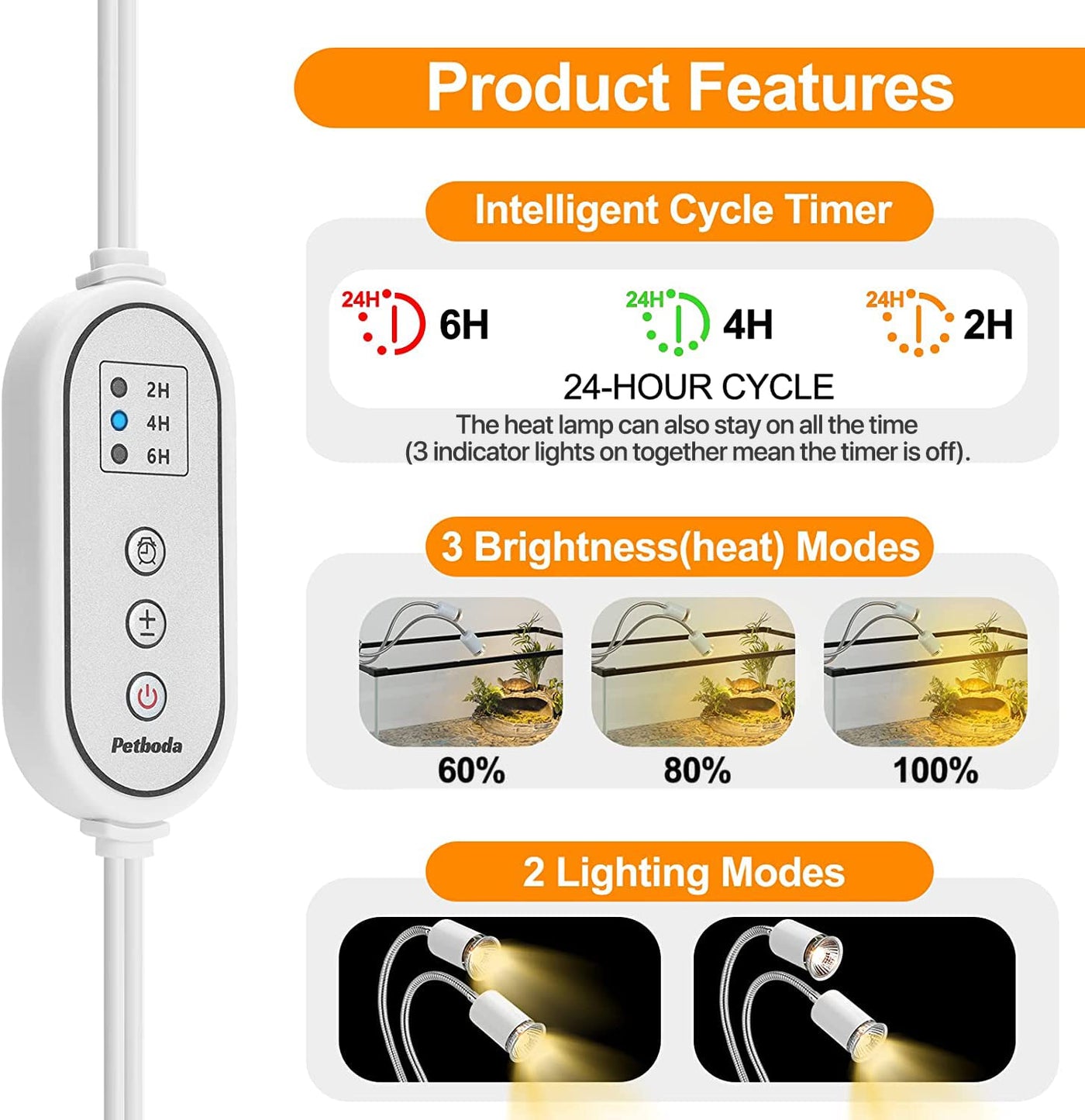 Petboda 2 Heads Reptile Heat Lamp with Cycle Timer Provide reptiles daily required UVA UVB imitation natural light to promote growth. Helps raise your pet s temperature, speed up blood circulation, aids metabolism and food absorption, and prevent calcium deficiency, soft armor, weak back and limbs, etc. Why Choose US ? ?The double-head design can meet the needs of a wide range of heating. ?Intelligent cycle timer ?Longer gooseneck design ?Adjustable brightness ?Premium ceramic lamp holders ?4 Bulbs included What s in Box: Reptile Heat Lamp X1 UVA 25W Bulb X2 UVA 50W Bulb X2 User Manual X1