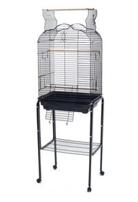 Parakeet Cockatiel Play top Metal Bird Cage with Stand 18 By 14 By 57 Inch H Overall dimensions: 18 x 14 x 57H (53H with rooftop closed) Cage only dimensions: 18 x 14 x 32H (28H with rooftop closed) 9/16 wire spacing Non-toxic epoxy coated finish Include three wooden perches, two feeder dishes, removable plastic bottom, tray and metal grate Large lay down front door Suitable for small birds: parakeet cockatiel love bird and conjure etc. Stand: Epoxy coated finish one shelf 4 casters.