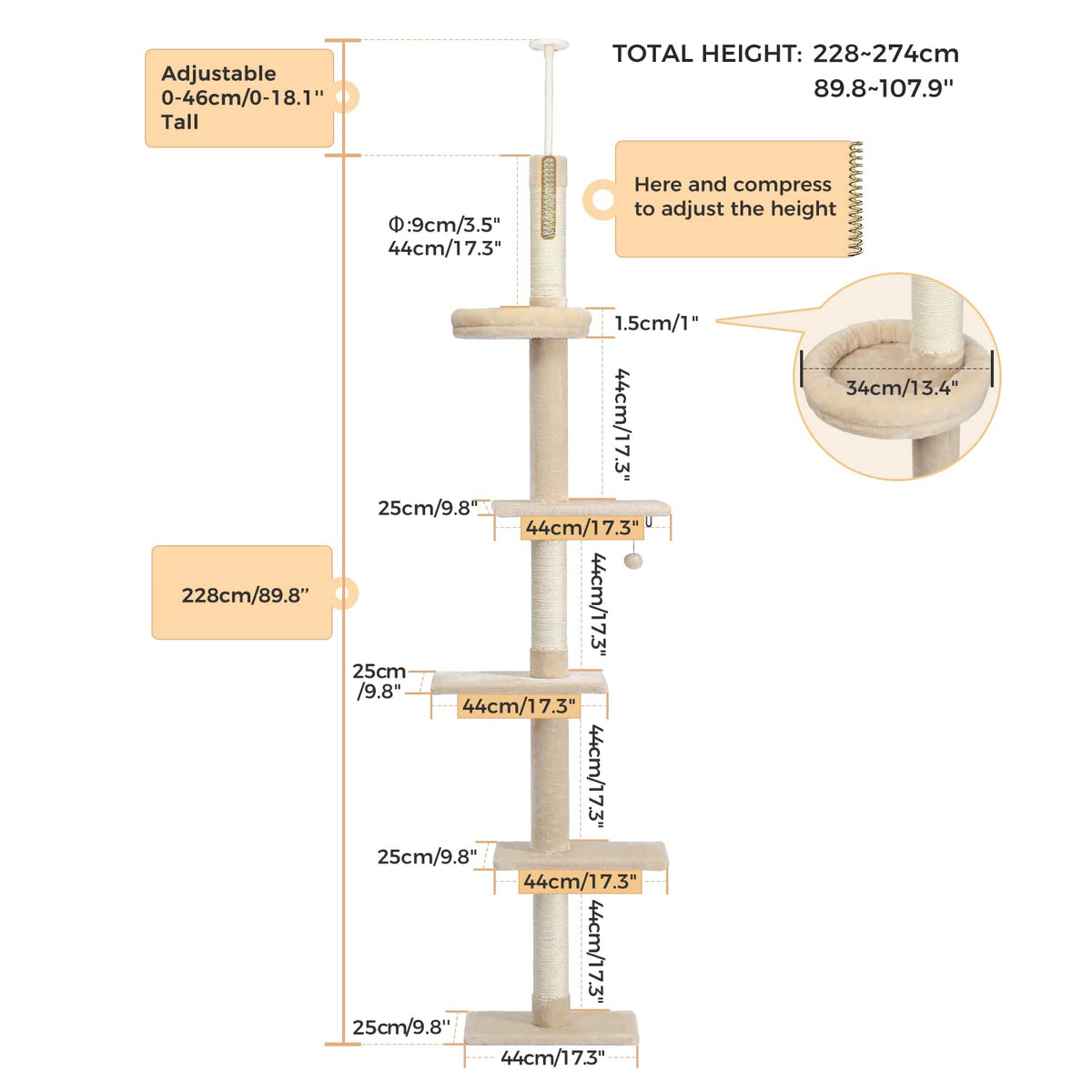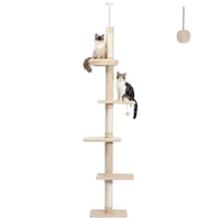 Petepela Cat Tree 5-Tier Floor To Ceiling Cat Tower Height Adjustable (95-108 Inches), Tall Kitty Climbing Activity Center With Scratching Post, Cozy Bed, Dangling Ball For Indoor Cats Upgraded Beige