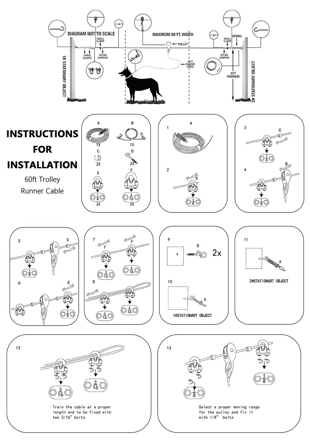 Q: How long is the tie-out cable included with the trolley system?A: The product includes a 60 ft tie-out cable along with a 10 ft runner cable, providing ample space for your dog to move around safely.