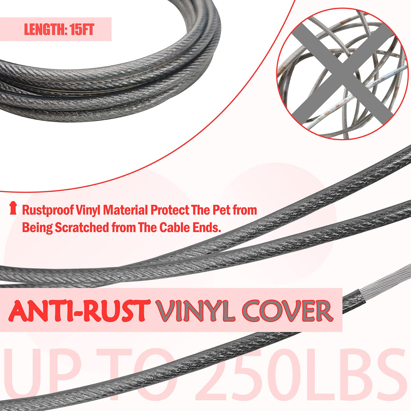 Petest Reflective Tie Out Cable with Crimp Cover for Super Dogs Up to 250 Pounds, 15 Feet
