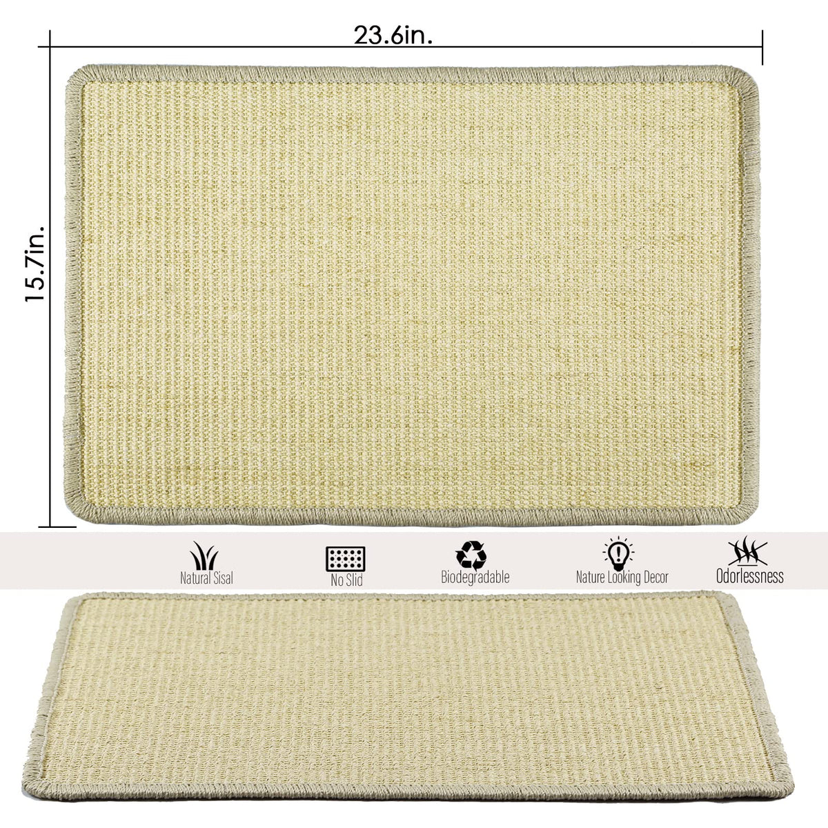 This cat sisal mat made from the leaves of the natural sisal plant.cat scratching pads for indoor cats has not been treated with any harsh oils& chemicals, or other substances which may harm your cat or the environment around cat scratch pad for wall.As this natural color is not dyed, sisal cat scratcher mat presents the original color of natural sisal, angled cat scratcher is more environmentally friendly and healthier. This cat scratch carpet is woven with thread woven structure. Because sisal is rough and strong enough to resist the sharpest claws for a long time. So sisal mat is more sustainable and durable. Without producing much debris and shreds on floors;You can wipe carpet cat scratcher with a damp cloth or vacuum cat scratch post for large cats with a hand-held vacuum,Floor cat scratchers easy to clean sisal cat scratcher. Back of the cat floor scratcher,Skid latex at the bottom, increase anti cat scratch s thickness and stability so that cat scratch mats for indoor cats is not easy to slide,And carpet cat scratcher with Velcro tapes, Cat scratch wall can be stick and stay firmly in the place of floor,wall,furniture,cat beds & furniture and any smooth object as wall mounted cat scratcher. Can not only be a cat scratching mat for indoor cats, scratcher for cats, Wall scratchers for indoor cats,but also a Cat sleeping mat, a cat bed,cat litter mat,flat scratching pad for cats,cat scratcher that files nails for wall,scratch pad for cats scratch pads for cats,of course, you can also use cat carpet scratching post as a extra large cat scratcher Use the velcro tapes,the best cat scratcher can be stick on furnitures and cat scratcher carpet will create a protecting layer between cat s paw and furnitures,Cats no longer scratch carpets, sofas, furniture, etc. When using extra large cat scratcher pad / carpet cat scratcher for the first time, you need to guide your cat to use sisal mat for cats.