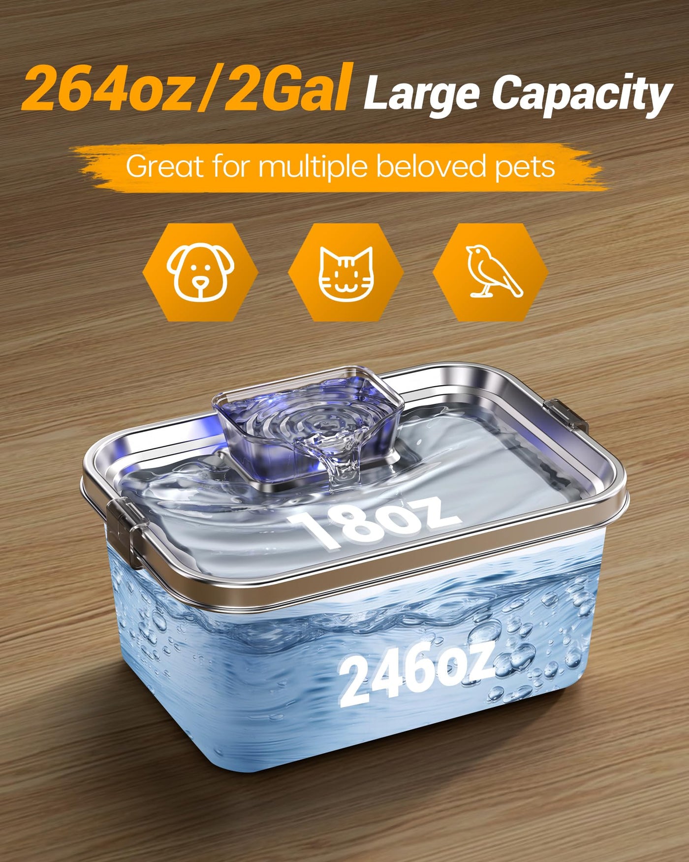 Pethind Dog Water Fountain 2Gal/264Oz Stainless Steel Pet Fountain For Large Dogs With 3 Filters Ultra Quiet Pump Easy To Clean