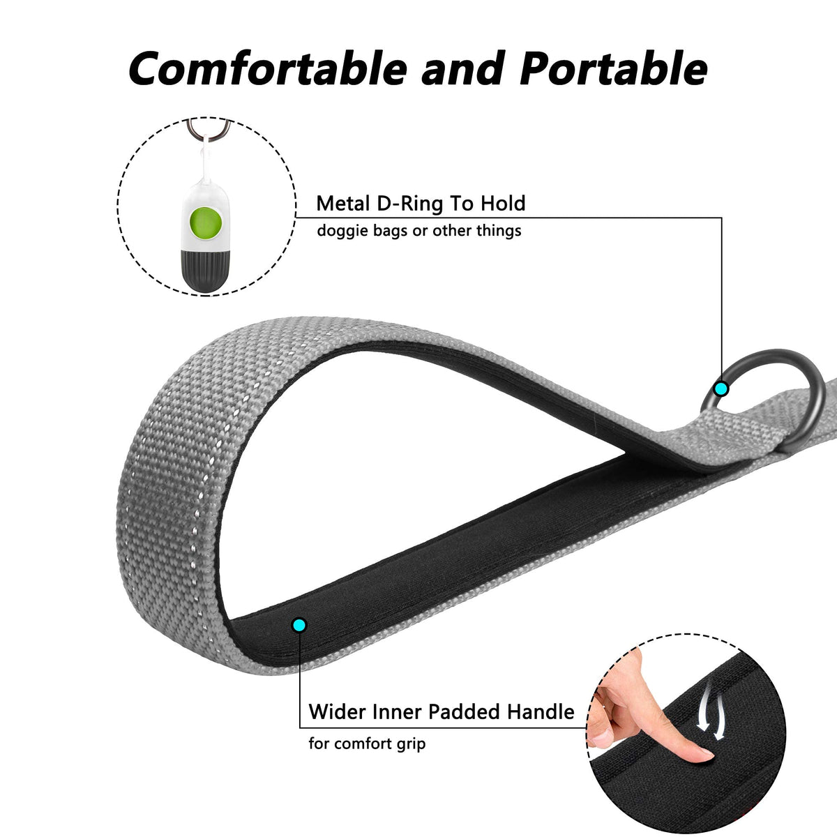 Q: How does the double padded handle improve comfort during walks?A: The leash features two premium neoprene padded handles that provide exceptional comfort, reducing strain on your hands during long walks and allowing for better control of your dog.