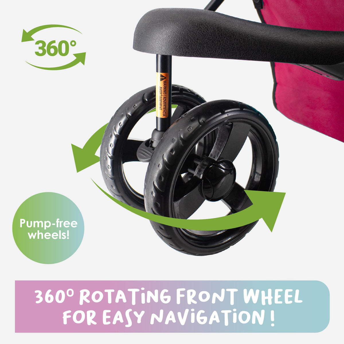 Petique Durable Pet Stroller, Easy Fold, Quality Mesh Windows, Large Storage Basket, Secure Cup Holder Tray, For Small To Medium Dog, Cat, Bunny, Supports Pets Up To 55Lbs - Razzberry