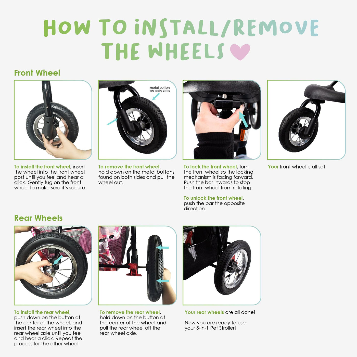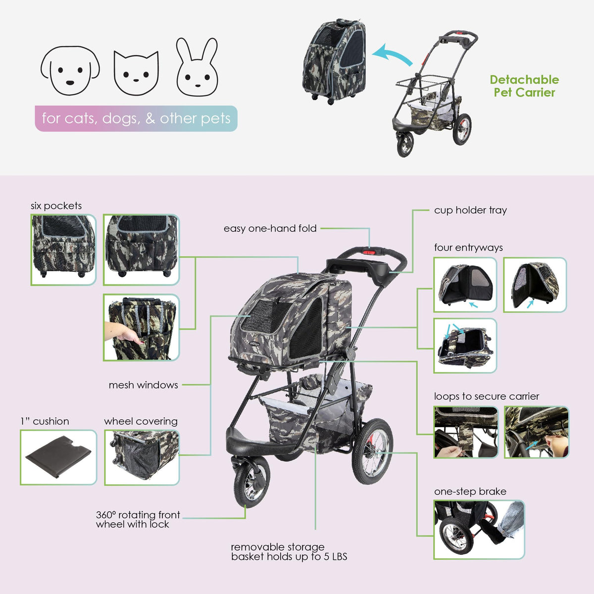 Winner of 2019 Pet Business Industry Recognition Award for the Dog/Cat Travel category Petique's 5-in-1 Pet Stroller makes adventures with your small dog, cat, and small animals safe and fun with FIVE travel options: The Car Seat option, The Stroller option, The Backpack option, The Roller option, and the Put On Your Luggage option. Petique's 5-in-1 Pet Carrier folds flat for easy storage and is readily usable during your trips! It has four 360 degree wheels to give your pets a smooth ride, six pockets, and a wheel covering to protect your clothes from getting dirty when you use it as a backpack! The hard exterior on the 5-in-1 Pet Carrier and the sturdy frame and bike tires in the 5-in-1 Pet Stroller keeps your pets safe during your travels! Features Petique's 5-in-1 Pet Carrier Helps relieve stress and anxiety for pets who do not like car rides Keeps your pets contained during car rides to create less distraction for the driver and helps maintain safety for all passengers A built-in leash 'seatbelt' on the inside to help keep your pets contained and safe while traveling Zipper openings on two side doors makes the pet carrier collapsible and fold flat for easy storage The hard frame makes the pet carrier durable and safe during your travels Lightweight with heavy-duty materials to ensure quality Four 360 degree wheels on the bottom of the pet carrier for a smooth ride for the pets and less weight for the human to carry FIVE convenient carrying and traveling options: Pet Stroller Pet Backpack Pet Car Seat Rolling Pet Carrier Luggage Attachment Feature SIX pockets total: Three open pockets on the right side with a secure drawstring on the middle pocket Two pockets with flaps and a magnetic button on the left side where you will find the strap to insert the car seat One large pocket in the back that you can also unzip to put over your luggage Wheel covering in the back to protect your clothes from getting dirty (this is located inside the back zipper on the bottom) Four entryways: left side door, right side door, front mesh window with a magnetic flap covering, and top mesh window Petique's 5-in-1 Pet Stroller Frame Durable Stroller Frame is made in the same manufacture as baby strollers One-handed folding mechanism for a smooth and easy fold Easy one-step dual brake for optimal safety Quality stainless steel bike tires with shock absorption to ensure a smooth ride Large removable storage basket - holds up to 5 LBs Removable Cup Holder Tray that holds up to 2 cups Benefits The car seat feature relieves anxiety/stress if your pets are not used to traveling in cars Relieves anxiety/stress for your pets if they are not used to being outdoors Small Dogs, Cats, and other animals under 25 LB Pets who love to run around in the car Pets who get car sick Pets who do not like to walk long distance Pets whose paws need protection because the ground is too hot or too cold Pets whose parents love to take them out traveling, hiking, shopping, etc. Humans who like the extra-large storage basket and two cup holder trays Let us know in the reviews how the 5-in-1 Pet Stroller benefits you and your pets Care Instructions The cover of the mat inside the pet carrier is machine washable (gentle machine wash in a laundry wash bag). Tumble dry on low. The foam insert in the mat is spot clean only When you clean the materials, do not leave the product in the sun to dry The storage basket is removable and machine washable in a laundry wash bag. Tumble dry low. Dimensions Assembled Dimensions:31.1'L X 22.05'W X 40.94'H Carrier Dimensions: 13'L X 11'W X 20.8'H Seat Space: 12'L X 10.5'W X 15.5'H 19.1'L X 11.61'W X 1.38'H Middle frame that holds the Pet Carrier: Supports pets up to 25 LB 5-in-1 Pet Carrier and Stroller Frame will be shipped separately *** Note: Actual product colors may vary slightly from images due to monitor settings and lighting conditions.***