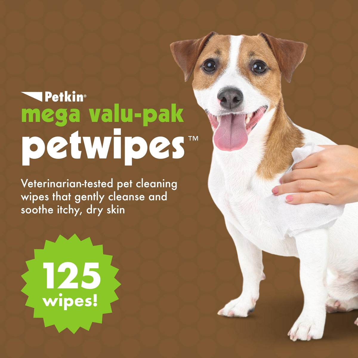 PETKIN PET WIPES FOR DOGS AND CATS – These veterinarian-tested pet cleaning wipes gently cleanse and soothe itchy, dry skin with organic oat extract. The fast and convenient way to keep your pet clean every day. Includes 1 pack of 125 wipes. | GENTLE FOR YOUR FURRY FRIEND – Use daily for quick cleanings, controlling pet odors and wiping dirty paws. Gentle enough to use every day around your pet's eyes, ears, paws, butt, face and body. | VETERINARIAN APPROVED – Each 7.5 x 6.7 inch soft cloth wipe is moistened with a natural cleansing formula, free of sulfates and parabens, that helps maintain a clean and healthy pet coat while restoring skin moisture and softness. Vanilla, oatmeal scent. | EASY TO USE – Open the lid and remove seal. Pull a dog wipe out. Close lid tightly. Gently wipe entire pet until clean. No water or rinsing is required. Use daily for quick cleanings, controlling pet odors and wiping dirty paws. | SUPER CONVENIENT, GOODBYE SHAMPOO – Perfect for at home and travel. Ideal as puppy wipes or for senior pets that are difficult to bathe. Reduce dander that can cause discomfort and keep your pet's coat soft and shiny.
