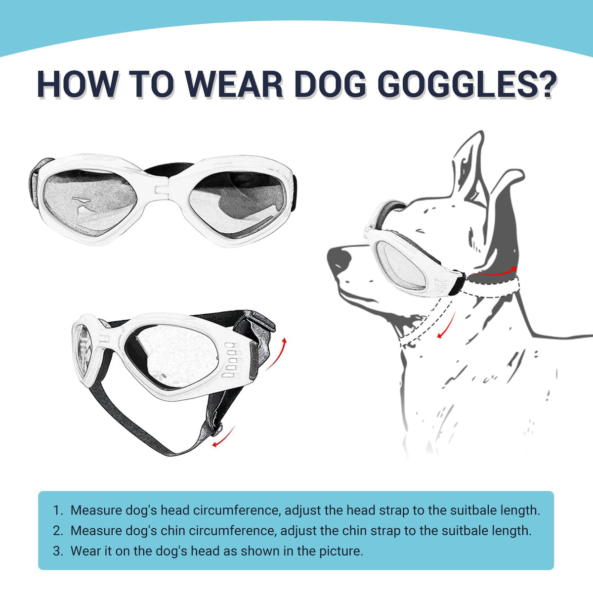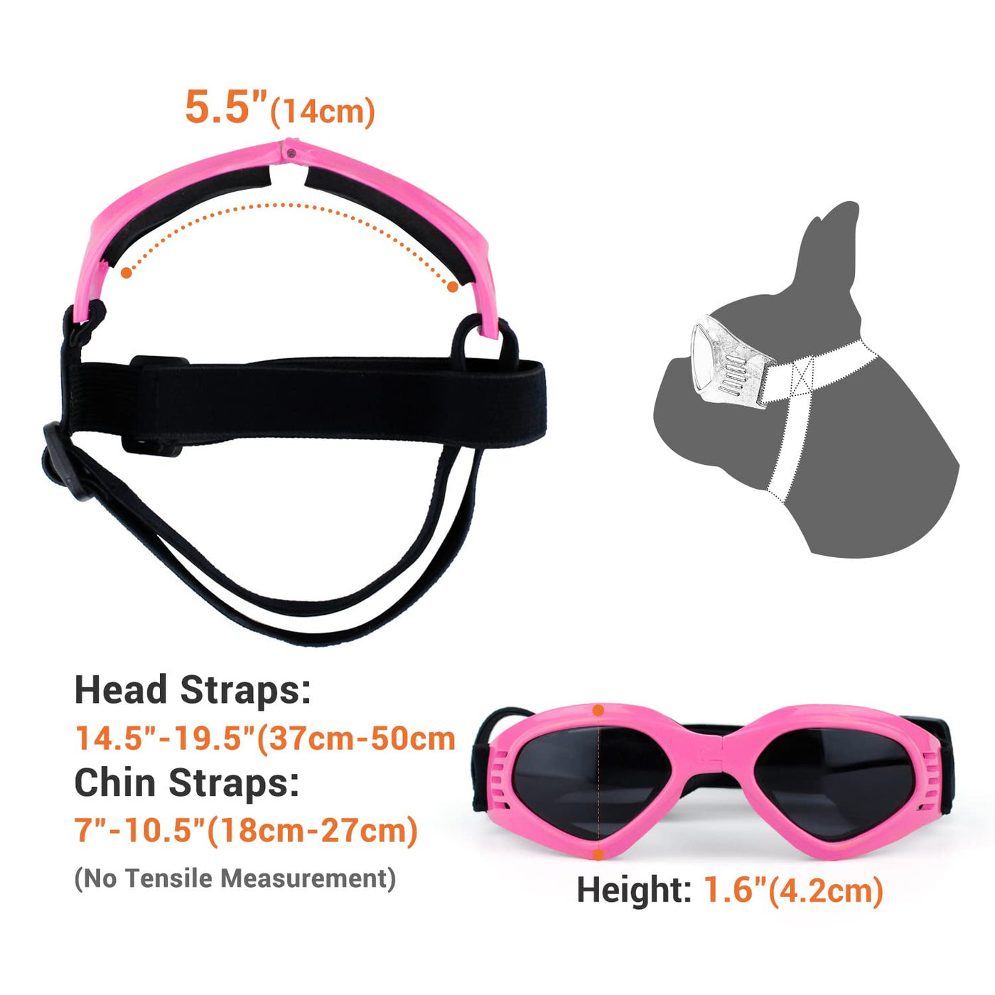 Color: Blue/White/Pink/Red/Yellow/Black Features: Adjustable double strap for snug fit Lens Height: 33mm Lens Width: 49mm Frame Width: 150mm Neck around 200-700mm between the pet can be worn.