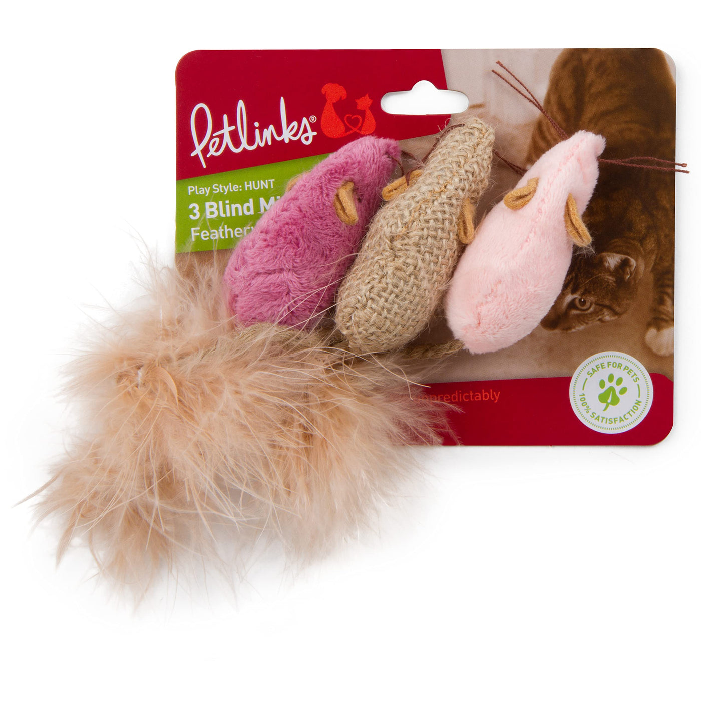 Q: What materials are the Petlinks 3 Blind Mice made from?A: The Petlinks 3 Blind Mice cat toys are made from high-quality materials including ultra-soft plush, durable burlap, and long fluffy feather tails to mimic the feel of real prey for enhanced play.