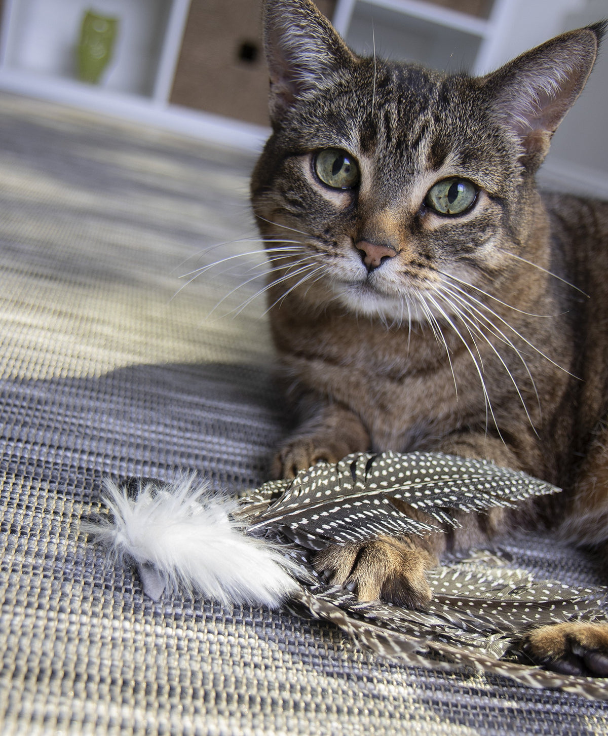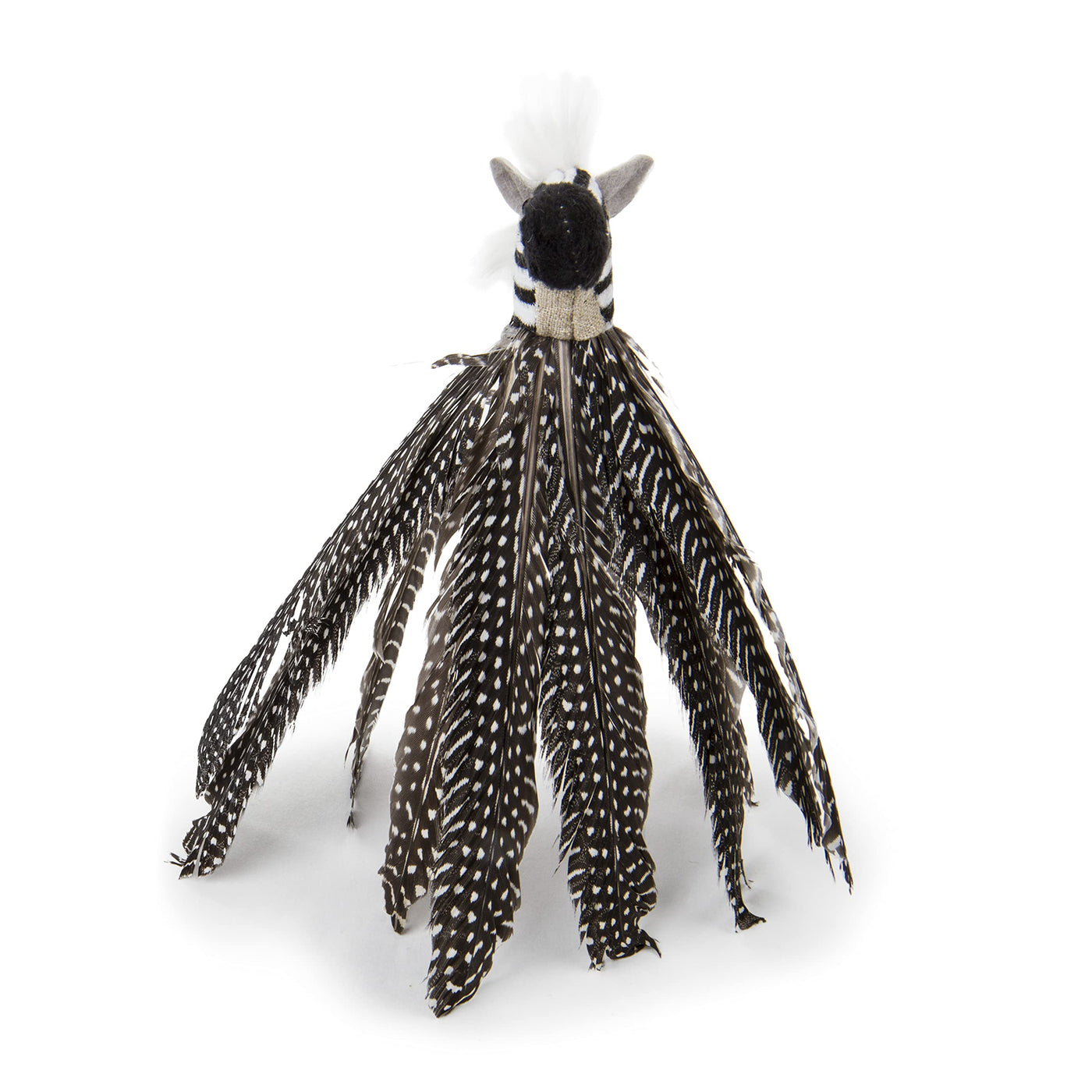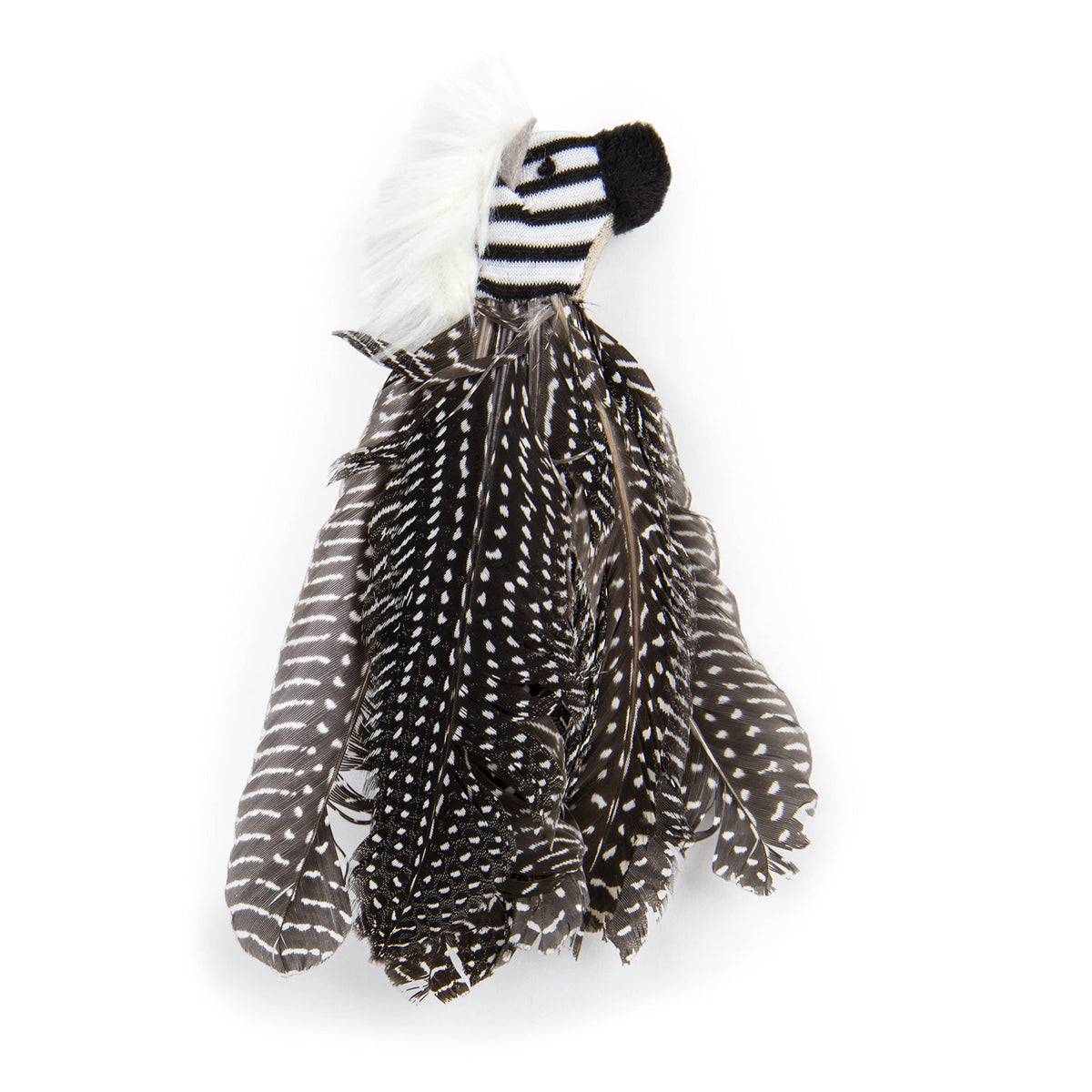 Q: What are the benefits of using the Zippy Zebra Feather Cat Toy for my cat?A: This toy encourages exercise and playful behavior by simulating the movement of real prey, which helps improve your cat's health and fitness. It also fosters bonding during interactive playtime.