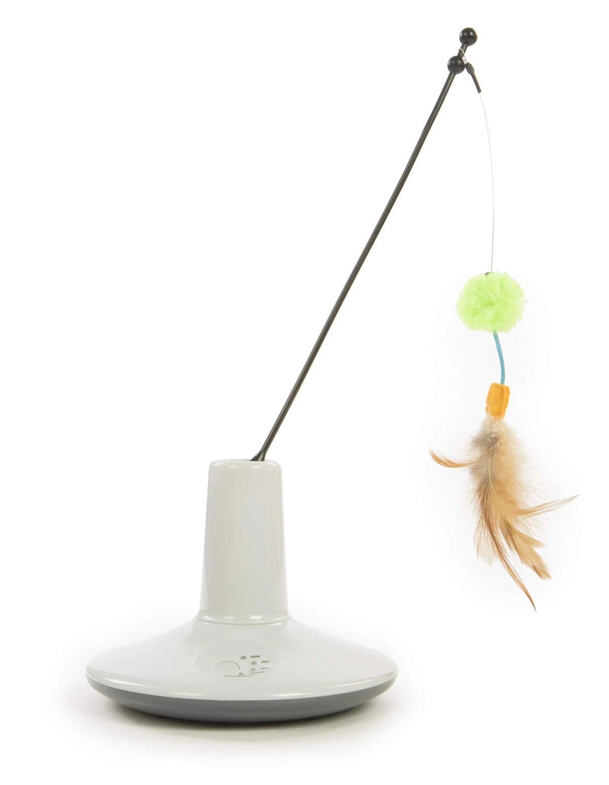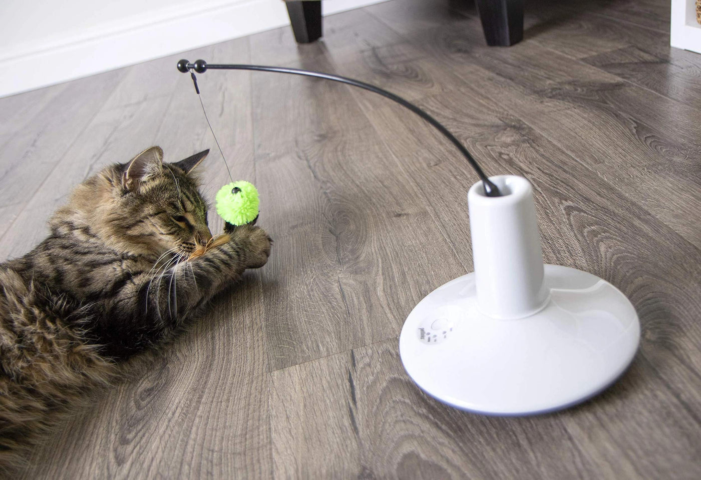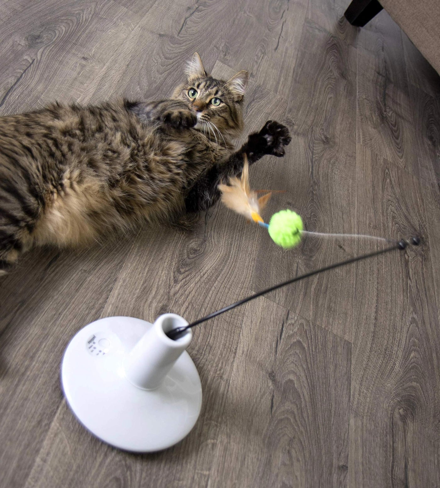 Q: What features make the Petlinks Pure Commotion Electronic Motion Wand Cat Toy unique?A: The Petlinks Pure Commotion features an electronic and robotic design that simulates realistic mouse-like movements, changing directions unpredictably to keep your cat engaged. Its flexible plastic wand bends and returns to shape, adding to the toy's dynamic play experience.