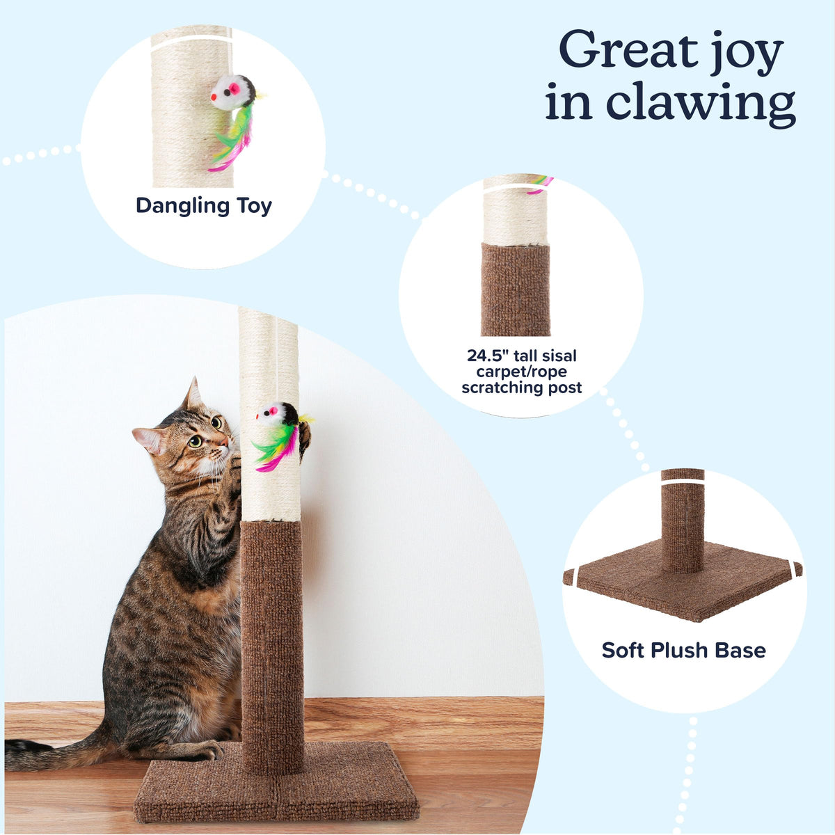 Give your cat or kitten the perfect place to scratch and play with the PETMAKER Cat Scratching Post. Cat scratching posts help to encourage physical activity, provide an area for stretching, and satisfy your cats natural scratching instincts. The tall, easy to assemble post features sisal rope and carpet scratching surface, as well as a durable carpet base that can also be used for scratching. Providing your cat with an outlet for their desire to scratch not only protects your furniture and carpeting but helps to promote healthy claws for your feline friend. The scratcher also features a hanging toy for interactive play that encourages activity and stimulation as your cat tries to catch the mouse!