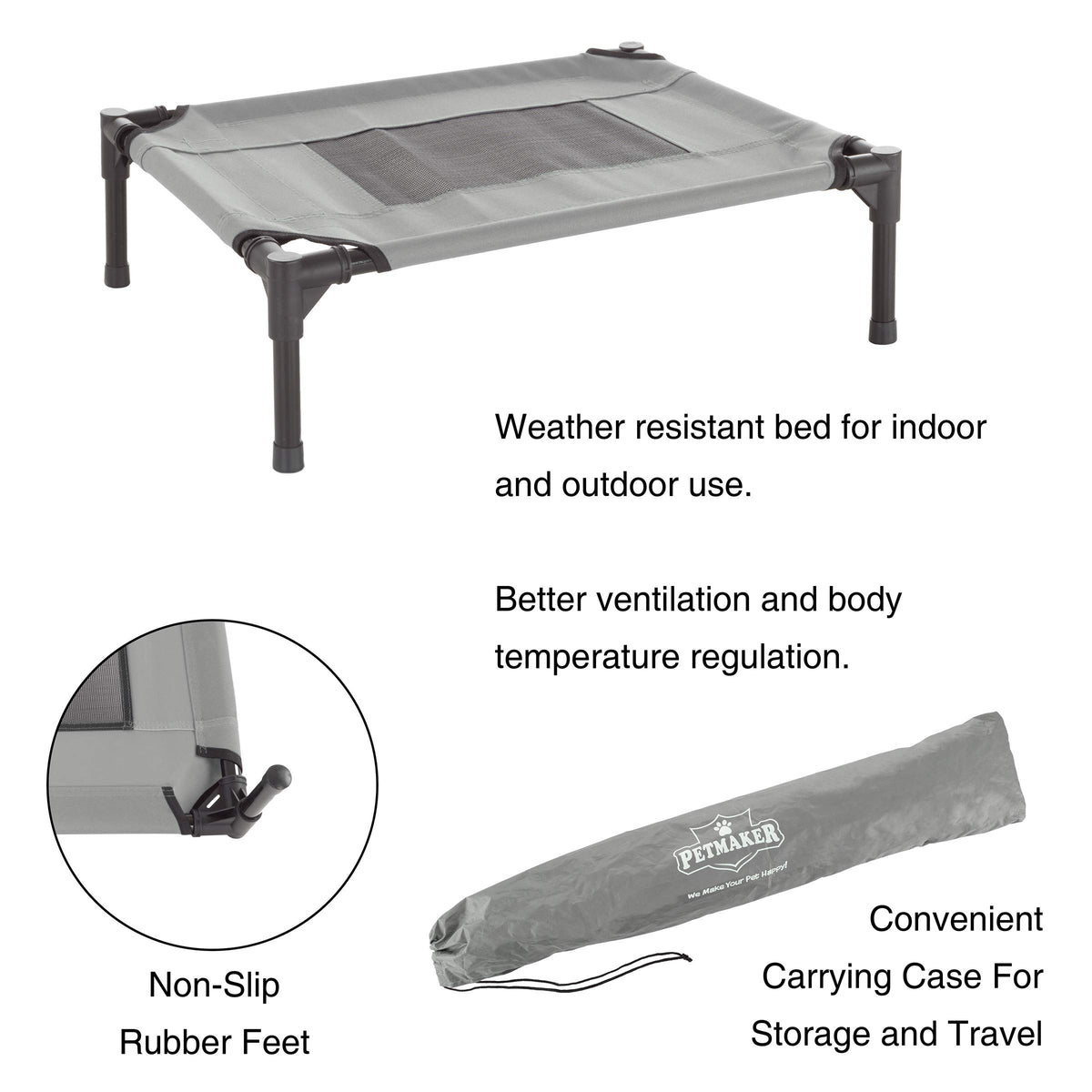 The Elevated Pet Bed by Petmaker is a comfortable and practical sleeping solution for your furry friend! Lightweight and portable with a carrying case included, this raised pet bed is a travel friendly option. Weather resistant and perfect for both indoor and outdoor use, this elevated bed provides better ventilation and body temperature regulation for your pet, helping them stay relaxed and happy even in hot or cold temperatures. Your dog, cat, or small pet will love resting on this cot-style bed!PETMAKER is committed to providing the consumer with the absolute best price and value on all of our products, which we ensure by applying a rigorous Quality Control process. . br>IMPORTANT: Avoid buying counterfeit products and transacting with unauthorized sellers. Look for our logo on the packaging for every one of our products. PETMAKER is a registered trademark protected by U.S. Trademark law and will be vigorously defended.