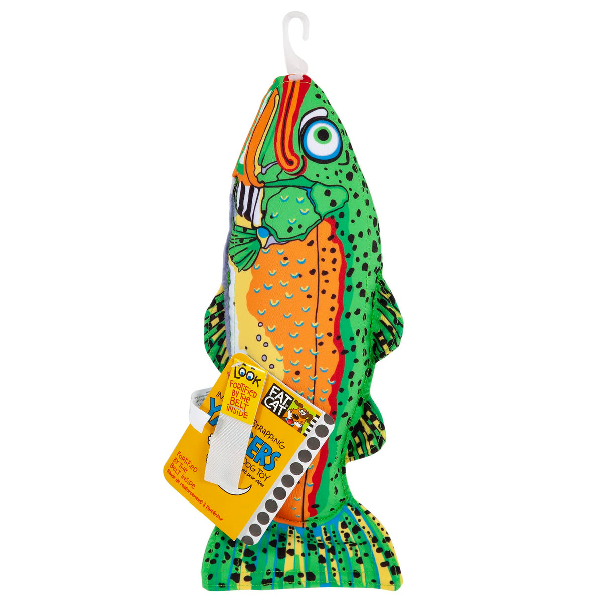 The Fat Cat Incredible Strapping Yankers Trout is a tough and durable dog toy like no other you ever seen. This toys held up to nearly a 1/2 ton of pulling pressure in test. It is fortified by a tightly woven nylon strap inside. It's strapping strong. Great for the dog that likes to play tug-o-war.