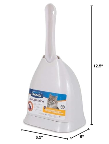 Q: What are the dimensions of the Petmate Scoop N' Hide?A: The Petmate Scoop N' Hide measures 6.5 inches in length, 5.5 inches in width, and 12 inches in height, making it a compact and functional addition to your cat care routine.
