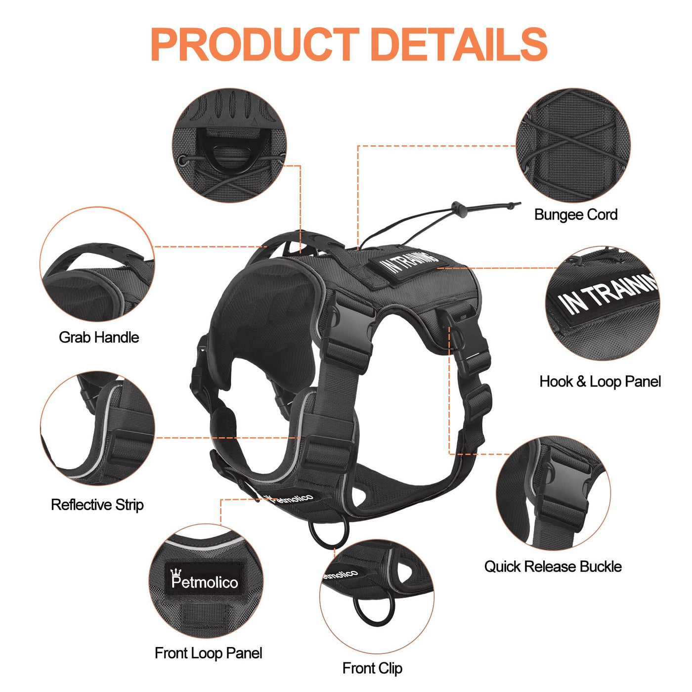 Petmolico Tactical Dog harness set includes a vest style harness + Tactical Dog Training Leash + Two Patches ( In Training & Service Dog) , ideal for service dog in training, daily walks, outdoor hiking, etc.