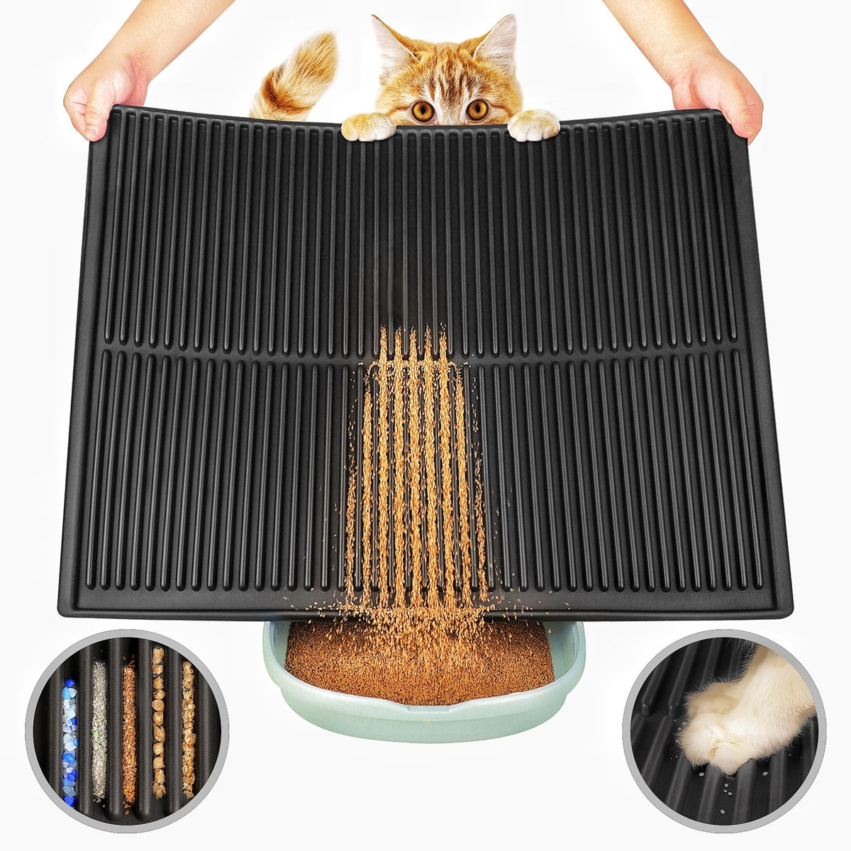 The PetNova Easy Clean Litter Mat is designed to catch litter from large cats, active kittens, and even multiple cats using a large litter box or multiple litter boxes.The deep groove design traps the litter from tiny paws and keeps it from spreading across your home. Whether your cat sprints quickly or walks slowly out of the litter box-this mats got it covered.The raised edges help prevent cat urine from spilling over, while the waterproof surface protects your floor by stopping urine from leaking through.Compared to those double-layered honeycomb and mesh litter mats, our single-layer, deep-grooved litter mat, with its waterproof surface, makes cleaning easy. Simply vacuum, shake, or rinse it off - no layers to pull apart, no machine washing needed to clean it thoroughly and easily, with absolutely no stress, and no lingering odors after cleaning.Its not a temporary fix, but a long-term companion. Made from durable polymer material, its easy to clean and as good as new after each cleaning. With no irritating odors, you can confidently use it for your beloved cat, accompanying you through every day of their growth.Youre not just cleaning up cat litter; youre creating a safe and comfortable haven for your beloved cat. With PetNova, easy life, easy love.