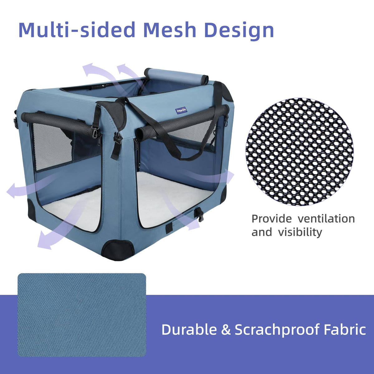 The Petprsco Collapsible Dog Crate Is An Ideal Portable Solution For Pet Owners, Featuring A Large Capacity Of 40X27X27 Inches, Suitable For Large Dogs Up To 90 Pounds. Its Sturdy Construction With Lightweight Steel And 600D Oxford Cloth, Along With Anti-Bite Mesh, Ensures Durability And Protection For Both The Crate And Your Home Or Car Interiors. The Crate Offers Fresh Airflow And A Better View With Solid Mesh Materials On All Sides And Three Doors For Easy Access. It Also Includes Useful Accessories Like A Plush Mat, A Warm Blanket, And A Foldable Travel Bowl, Providing Extra Comfort For Your Pet. Safety Features Include An Adjustable Leash Attachment And Lockable Zippers On The Doors, Ensuring Your Pet'S Security During Travel. With A Convenient Carrying Handle And Side Pockets For Snacks And Toys, This Crate Is Perfect For A Happy And Relaxing Trip Or Quick Visits To The Vet.