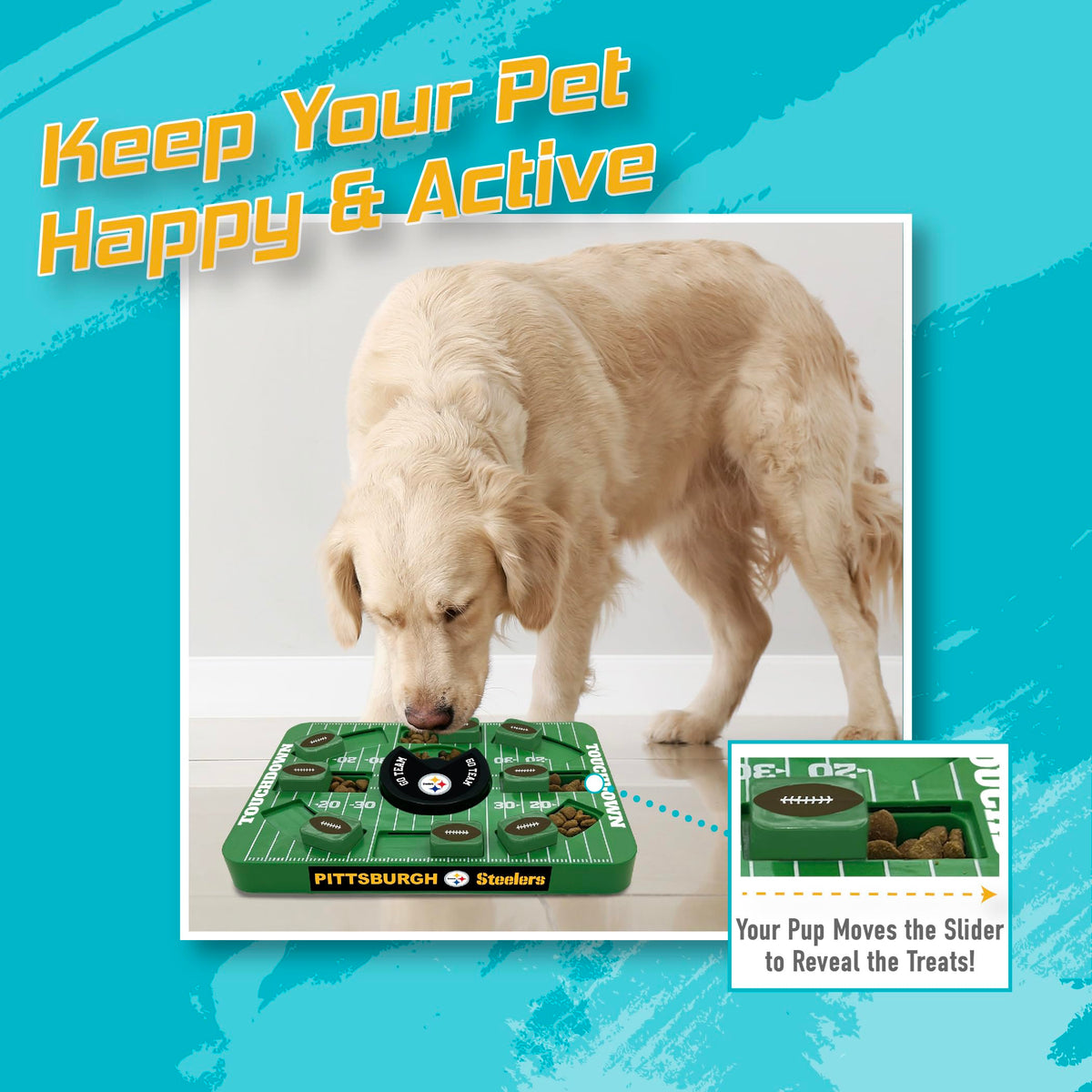 Introducing The New Pets First Nfl Large Puzzle Treat Dog Toy - The Ultimate Interactive Dog Treat Toy Designed To Exercise Your Pet'S Mind And Provide Hours Of Entertainment. This Dog Puzzle Is Perfect For Reducing Destructive Behavior By Engaging Your Furry Friend'S Natural Hunting Instincts And Providing A Stimulating Challenge.This New And Improved Large Puzzle Treat Toy Features Multiple Hiding Places For Your Dog'S Favorite Treats. With Its Various Compartments And Hidden Slots, Your Pet Will Have A Blast Searching And Sniffing Out The Hidden Treasures. It Sports A New Look And Design And Is Made In A Larger Size For All Dogs. This Not Only Provides Mental Stimulation But Also Encourages Your Dog'S Instinctive Hunting Behavior, Keeping Them Engaged And Satisfied.By Engaging Your Dog'S Mind And Senses, This Interactive Toy Helps Prevent Boredom And The Resulting Destructive Behaviors Often Associated With It. Your Pet Will Be Focused And Occupied, Channeling Their Energy Into Solving The Puzzle And Retrieving The Tasty Rewards.The Pets First Nfl Large Puzzle Treat Dog Toy Is Designed With Your Pet'S Safety And Durability In Mind. Made From High-Quality Materials, It Can Withstand Rigorous Play And Chewing, Ensuring Long-Lasting Entertainment For Your Furry Friend.Choose From A Variety Of Nfl Team Logos And Vibrant Colors To Showcase Your Pet'S Team Spirit While They Enjoy Playtime. This Puzzle Treat Toy Is Not Only Entertaining But Also A Great Way To Bond With Your Pet And Share Some Joyous Moments And Team Spirit Together.Exercise Your Pet'S Mind, Reduce Destructive Behavior, And Encourage Their Natural Hunting Instincts With The Pets First Nfl Puzzle Treat Dog Toy. With Its Many Hiding Places For Treats, This Interactive Dog Toy Is Sure To Become Your Pet'S Favorite Go-To For Endless Fun And Delicious Rewards.Choose Your Team And Correct Size, And Add To Cart Now!* Don'T Forget To Check Out Our Premium Training Pads, Aka The Best Puppy Pads Sold On Amazon!Pets First:Pets First Company Has Established Itself As The Largest Sports-Licensed Pet Product Company In The Country.Pets First Has Gained Its Reputation In Providing Every Pet Owner With Premium Licensed Pet Products; From Unique And Colorful Apparel Items To Fun And Playful Toys And Accessories.Working With The Latest Technology, Our Creative Designers Choose From The Highest Quality Materials To Provide Durable, Unique And Innovative Pet Merchandise.Our Factories Follow The Highest Standards Of Safety Guidelines To Ensure Your Pet'S Security, While Providing A Long Lasting Product.Licenses:Pets First Has Secured Licenses With Major League Baseball (Mlb), Major League Baseball Players Association (Mlbpa), Football, Football Players, National Hockey League (Nhl), National Basketball Association (Nba), Major League Soccer (Mls) (Real Madrid C.F. Soccer Club Real Madrid Club De F Tbol), Laurdiy, Realtree & Over 50 Of The Top Colleges In The Country (Ncaa).When You Are A Pet Owner, You Are Part Of The Pets First Family! At Pets First We Always Have You Covered!