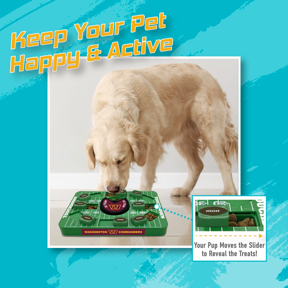 Introducing The New Pets First Nfl Large Puzzle Treat Dog Toy - The Ultimate Interactive Dog Treat Toy Designed To Exercise Your Pet'S Mind And Provide Hours Of Entertainment. This Dog Puzzle Is Perfect For Reducing Destructive Behavior By Engaging Your Furry Friend'S Natural Hunting Instincts And Providing A Stimulating Challenge.This New And Improved Large Puzzle Treat Toy Features Multiple Hiding Places For Your Dog'S Favorite Treats. With Its Various Compartments And Hidden Slots, Your Pet Will Have A Blast Searching And Sniffing Out The Hidden Treasures. It Sports A New Look And Design And Is Made In A Larger Size For All Dogs. This Not Only Provides Mental Stimulation But Also Encourages Your Dog'S Instinctive Hunting Behavior, Keeping Them Engaged And Satisfied.By Engaging Your Dog'S Mind And Senses, This Interactive Toy Helps Prevent Boredom And The Resulting Destructive Behaviors Often Associated With It. Your Pet Will Be Focused And Occupied, Channeling Their Energy Into Solving The Puzzle And Retrieving The Tasty Rewards.The Pets First Nfl Large Puzzle Treat Dog Toy Is Designed With Your Pet'S Safety And Durability In Mind. Made From High-Quality Materials, It Can Withstand Rigorous Play And Chewing, Ensuring Long-Lasting Entertainment For Your Furry Friend.Choose From A Variety Of Nfl Team Logos And Vibrant Colors To Showcase Your Pet'S Team Spirit While They Enjoy Playtime. This Puzzle Treat Toy Is Not Only Entertaining But Also A Great Way To Bond With Your Pet And Share Some Joyous Moments And Team Spirit Together.Exercise Your Pet'S Mind, Reduce Destructive Behavior, And Encourage Their Natural Hunting Instincts With The Pets First Nfl Puzzle Treat Dog Toy. With Its Many Hiding Places For Treats, This Interactive Dog Toy Is Sure To Become Your Pet'S Favorite Go-To For Endless Fun And Delicious Rewards.Choose Your Team And Correct Size, And Add To Cart Now!* Don'T Forget To Check Out Our Premium Training Pads, Aka The Best Puppy Pads Sold On Amazon!Pets First:Pets First Company Has Established Itself As The Largest Sports-Licensed Pet Product Company In The Country.Pets First Has Gained Its Reputation In Providing Every Pet Owner With Premium Licensed Pet Products; From Unique And Colorful Apparel Items To Fun And Playful Toys And Accessories.Working With The Latest Technology, Our Creative Designers Choose From The Highest Quality Materials To Provide Durable, Unique And Innovative Pet Merchandise.Our Factories Follow The Highest Standards Of Safety Guidelines To Ensure Your Pet'S Security, While Providing A Long Lasting Product.Licenses:Pets First Has Secured Licenses With Major League Baseball (Mlb), Major League Baseball Players Association (Mlbpa), Football, Football Players, National Hockey League (Nhl), National Basketball Association (Nba), Major League Soccer (Mls) (Real Madrid C.F. Soccer Club Real Madrid Club De F Tbol), Laurdiy, Realtree & Over 50 Of The Top Colleges In The Country (Ncaa).When You Are A Pet Owner, You Are Part Of The Pets First Family! At Pets First We Always Have You Covered!