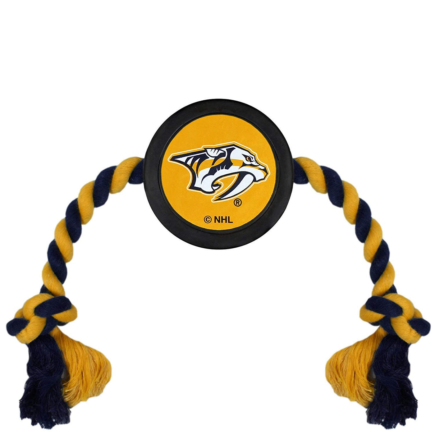 Show support for your favorite team while having fun with your sporty pup! This NHL Hockey Team Puck Toy for DOGS & CATS is made out of heavy duty nylon with a tough web trim. Tuggable squeaker for dogs that love to play and squeak their dog toys. Great for strong chewers and provides hours of play and exercise! SIZING & USE: This dog toy is approximately 1 inch long and 15 inches wide (including the ropes). It is intended for use as a fetch, tug, or toss toy or as a chew toy. As with any toy, DO NOT leave your pet, cat, dog alone and unsupervised. While no dog toy is ever guaranteed, this hockey puck toy has been developed to provide plenty of playtime when used as instructed.