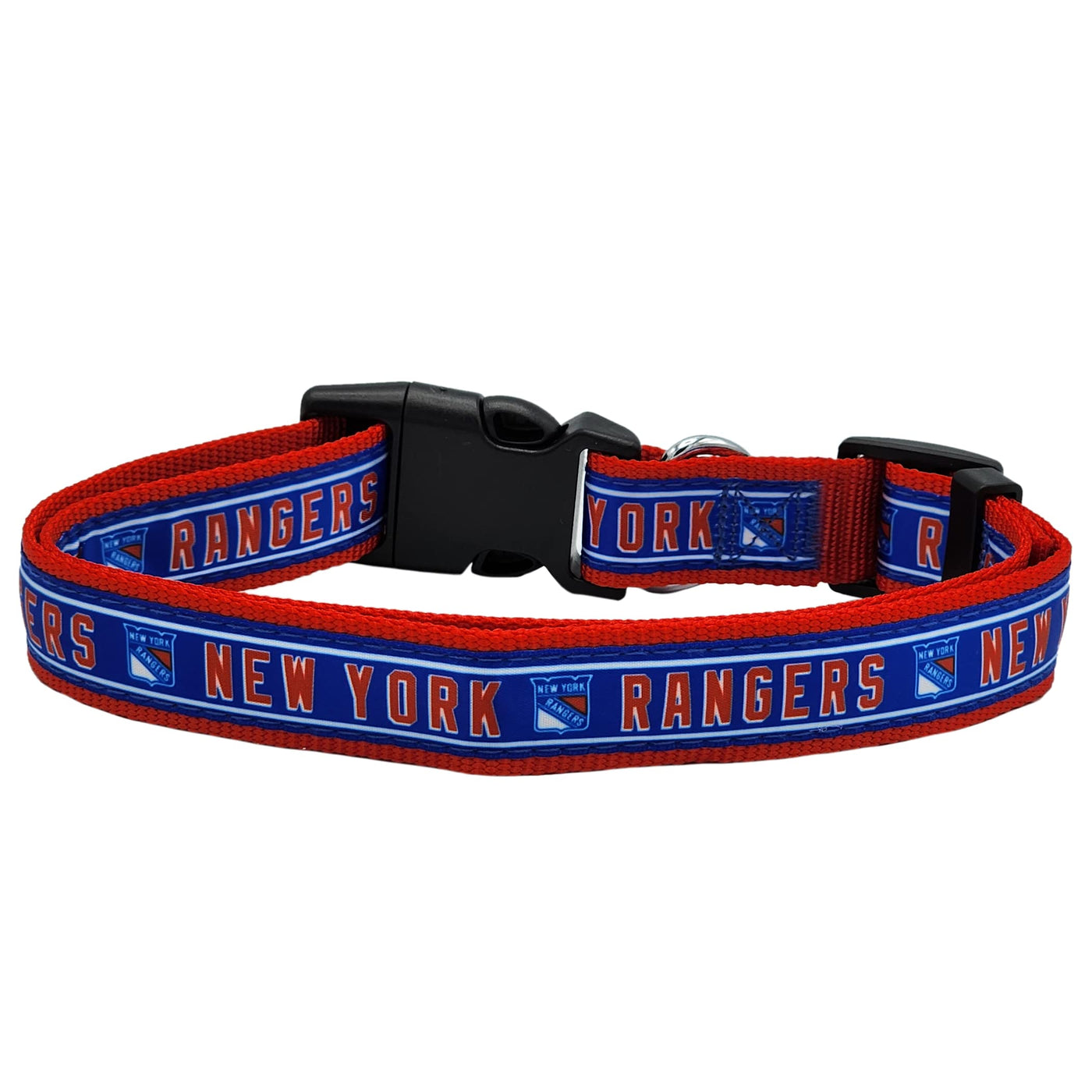 • Q: What sizes are available for the Pets First NHL New York Rangers Collar? A: The Pets First NHL New York Rangers Collar is available in three sizes: Small, Medium, and Large. The Medium size fits pets with a neck circumference of 12 to 18 inches.