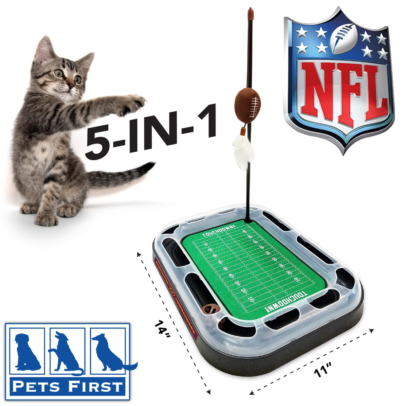 The NEW Pets First NFL CAT SCRATCHING TOY! GREAT for Cats, Kittens, Kittys & other Cute Cats! While you might already have some cat toys & accessories such as the Petstages Cat Tracks or the Bergan Turboscratcher or the SmartyKat Catnip Toy etc. When you need a cat toy to be all football, while also being a total blast for your cat, this is the toy you & your cat want. Wanna know why all PET OWNERS, CAT OWNERS, DOG & CAT OWNERS are buying the Pets First NFL FOOTBALL CAT SCRATCHER TOY? There are so many ways to keep your cat busy & satisfied while getting a kick out the football motif. Looking for a gift for a friend, this cat toy will have them kicking field goals, punting and scratching up the field. The rolling Cat Ball toy around the field is a wonderful chase toy that cats love to poke at & make noise with the bell sound. Dont forget the field is adorned with your favorite team on the sides. When you envision a Cat scratch-board you never picture a football field and that is what Pets First has delivered here. This emerald green football field Cat Scratchboard is as tough as your average football player. Its designed to be tough enough to take what your cat can bring to the fight. Dont give your cat a weak flimsy scratch toy, give them an NFL licensed green football field of scratchboard. Many cat toys have a ball chasing gimmick, but this ball makes noise and has several windows in the frame for your cat to swipe at and push around. This Cat ball rolls inside the tracks around the football field & it cant be removed so its always with your toy and not loose around your floor. The question isnt will your cat be entertained? but more like will you be able to keep them away from this incredible NFL licensed football cat toy? . One of the many unique parts to this toy is the refillable catnip football toy with feathers. This football will know pain, when your cat sets its sights upon it. Since the football can be filled and refilled with catnip, your cat will never stop having fun. 1 FRESH CATNIP INCLUDED! The white feathers attached are there for extra flair for your cat to have even more stimulation. If youre a football fan and a cat owner or a friend who is and has a cat look no further. You have found the ultimate interactive cat toy for the ultimate fan. This is the #1 CAT TOY! ADD TO CART NOW to see why! Choose your favorite NFL FOOTBALL TEAM player and Add to Cart Now as your Four-legged fan isnt able to purchase on but is waiting on you to place the order!! Pets First Overview: Pets First has established itself as the largest sports-licensed pet product company in the country. @ Pets First we provide every pet owner with premium licensed pet products. From unique & colorful apparel items to fun & playful accessories & toys. We follow the highest standards of safety guidelines to ensure your pets security, while providing a long-lasting product. Working with the latest technology, our creative designers choose from the highest quality materials to provide durable, unique and innovative pet merchandise. Pets First Licenses: Major League Baseball (MLB) & Major League Baseball Players Association (MLBPA). National Football League (NFL) & National Football League Players Association (NFLPA)National Basketball Association (NBA). National Hockey League (NHL). Realtree (RT). Real Madrid (RM) MLS Soccer. LAURDIY - For all Lauren Riihimakis fans & followers. Over 50 of the top colleges in the country (NCAA) Football & Basketball. Pet owners want to be proud of the team gear their pet wears. Thats what we had in mind when we designed our pet apparels. Our NCAA, NFL, NFLPA, MLB, MLBPA, NBA, NHL, MLS, LaurDIY and Realtree apparel are made of satin and poly-mesh fabric. Each jersey, hoodie, and shirt has the team logo and wordmark screenprinted, along with a league approved number. Our Products: Pets First is known as the source for pet products. The depth of product offering from Pets First is unparalleled in the sports-licensed pet product industry. Pets First continually strives to build on its success & gain market share by developing and executing sought-after products that pet owners feel confident purchasing for their pets. When you are a pet owner YOU ARE PART OF THE Pets First FAMILY!