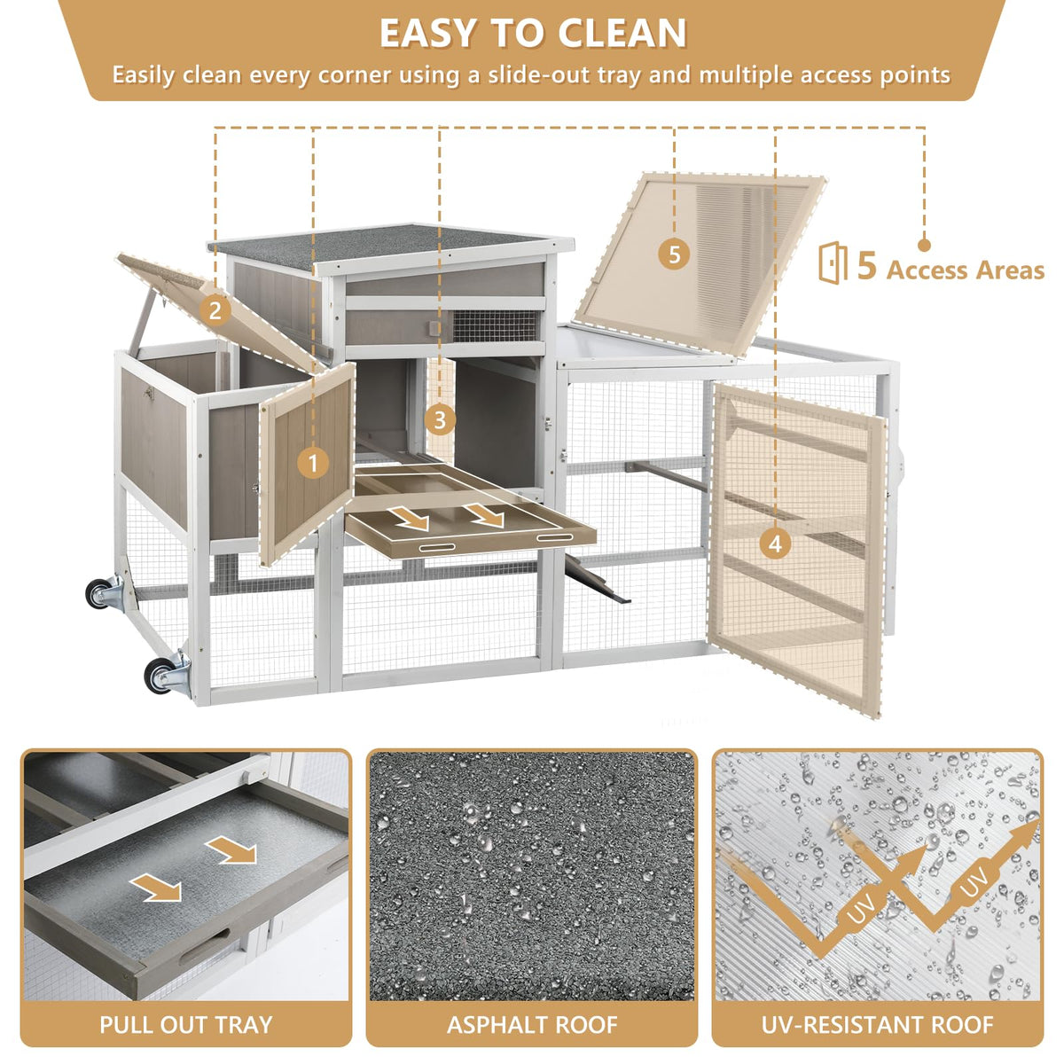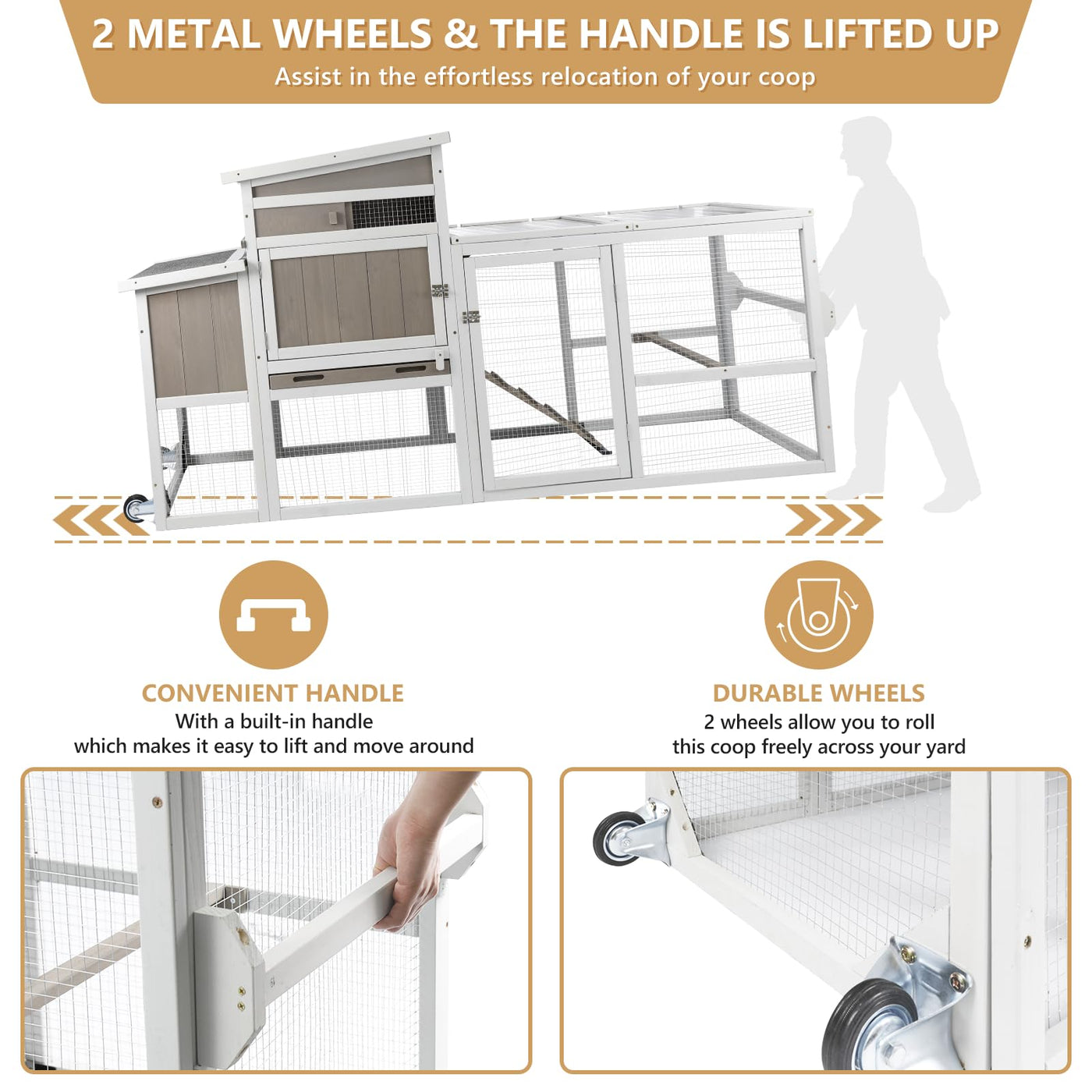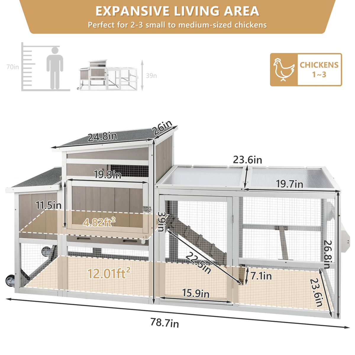 Give your chickens a safe, cozy, and functional space with this mobile chicken coop, thoughtfully designed for backyard chicken keepers, homestead families, and small-scale farmers. Whether you 're gathering fresh eggs each morning, this hen house offers the durability, flexibility, and ease of use you need. Built with a waterproof asphalt roof and a UV-resistant panel above the run, this coop provides year-round protection against rain, wind, and snow. The sturdy metal mesh and lockable doors keep predators out and your flock secure. The nesting box features a lift-open lid for effortless egg collection, and removable dividers to accommodate your hens ' laying preferences. Cleaning is quick and stress-free, thanks to a slide-out tray-perfect for busy families or first-time chicken owners. Two durable metal wheels make the coop easy to reposition in your yard or garden, and its expandable design allows you to connect multiple coops for growing flocks. Measuring 78.7 ''L x 26 ''W x 39 ''H, this backyard chicken coop offers 16.83 ft of space(4.82ft on the 2nd level and 12.01fton the 1st level).-ideal for housing 1 to 3 chickens, ducks, bunnies, or other small pets. Assembly is simple with clearly labeled parts and step-by-step instructions. Whether youre starting your first flock or upgrading your existing setup, this coop makes a thoughtful gift for chicken owners, DIY moms, or anyone embracing a self-sufficient lifestyle-especially for Mothers Day or other special occasions.