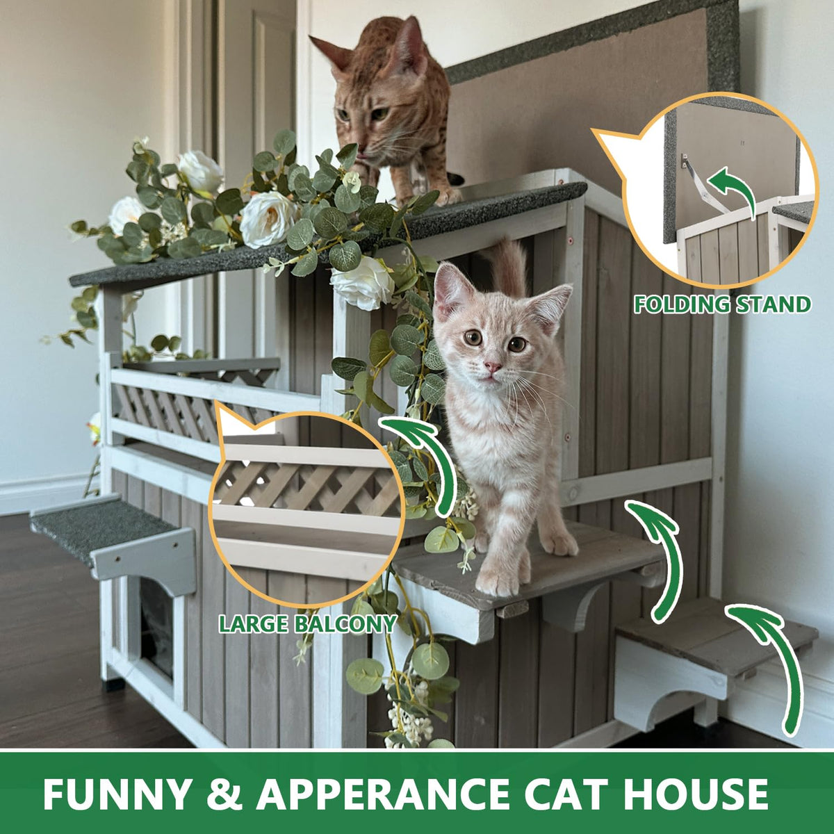 Petscosset Large Outdoor Cat House Weatherproof With Balcony 2-Story Feral Cats Shelter Indoor Cat Condo With Escape Door & Open