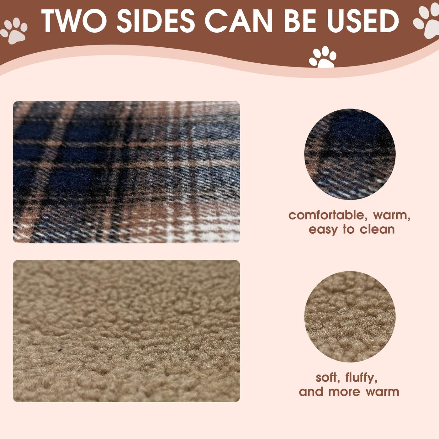 Double Sided Usable- Two Sides Use Different Fabrics. Shake Grain Suede Is Soft And Fluffy, Providing Better Warmth Retention. The Brushed Surface Is Warmth And Comfortable. Can Be Used According To Needs. Wide Use- Choose According To Your Needs, Use The Fluffy Side In Cold Days And The Flat Side In Warm Days. The Size Is Suitable For 24''X 16.5'' Pet Carrier. Can Accommodate Cats, Small Dogs, Rabbits, Etc Warmth And Soft- No Electricity Required. Filled With Polyester, Soft And Fluffy, It Can Maximize The Preservation Of Pets' Body Temperature And Has Good Resilience. Easy Clean- Non Removable, Directly Put Into The Washing Machine. In Order To Use Long Time, Can Choose Hand Wash Mode. Customer Service- If You Have Any Questions About The Product,Please Feel Free To Message Us. We Will Solve Perfectly.
