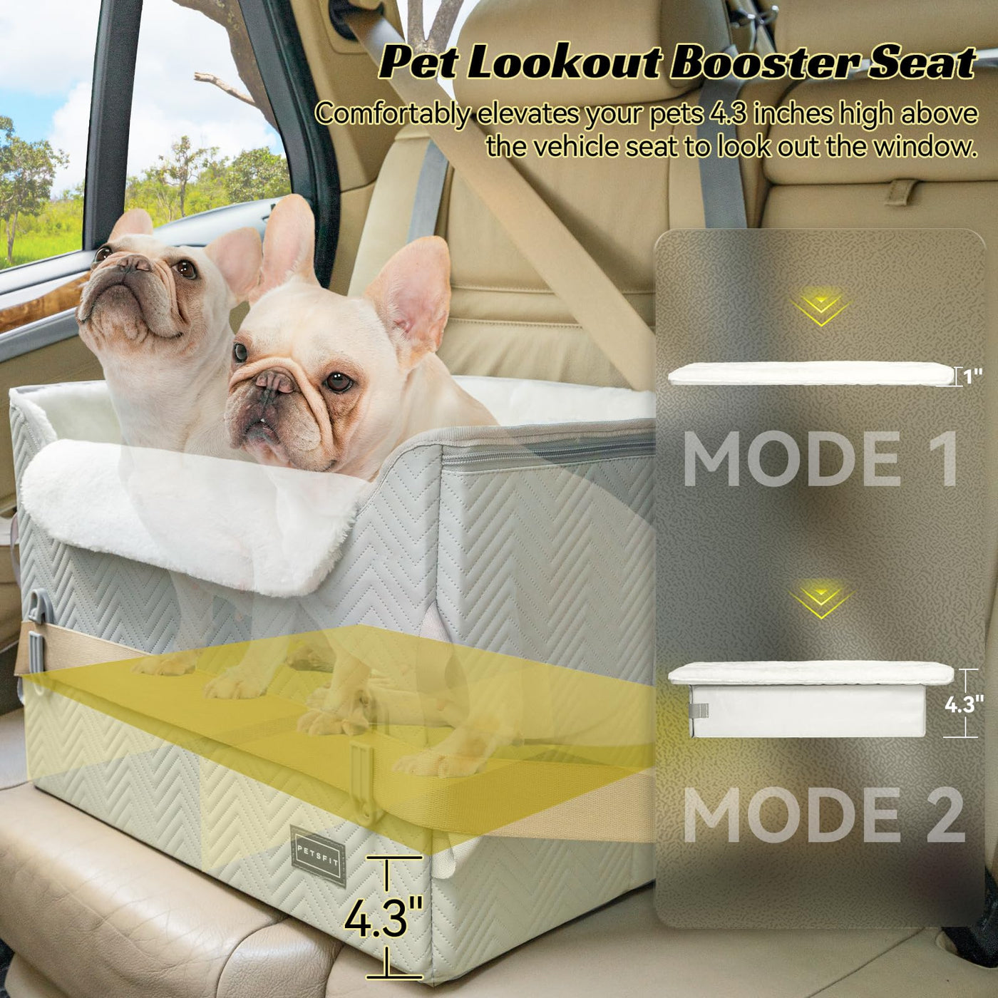 Q: What features make this car seat suitable for anxious or motion-sick dogs?A: The booster seat elevates your dog 4.3 inches above the vehicle seat, allowing them to enjoy a window view, which can help reduce anxiety and motion sickness during travel.